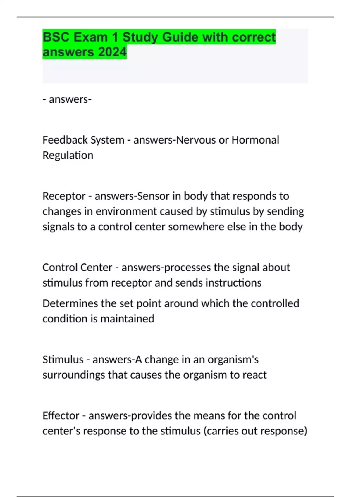 - answers- Feedback System - answers-Nervous or Hormonal Regulation Receptor - answers-Sensor in body that responds to changes in environment caused by stimulus by sending signals to a control center somewhere else in the body Control Center - answers-processes the signal about stimulus from receptor and sends instructions Determines the set point around which the controlled condition is maintained Stimulus - answers-A change in an organism's surroundings that causes the organism to react Effector - answers-provides the means for the control center's response to the stimulus (carries out response) Chemical - answers-Most basic level Oxygen, carbon, hydrogen, and nitrogen make up 96% of the body's mass Made up of atoms Cellular - answers-made up of the smallest unit of living matter, the cell Sum of chemical reactions allow the cell to carry out a specific and unique task Epithelial - answers-A body tissue that covers the surfaces of the body, inside and out connective tissue - answers-A body tissue that provides support for the body and connects all of its parts muscular tissue - answers-Contracts and moves the various parts of the body. nervous tissue - answers-carries electrical messages back and forth between the brain and every other part of the body. Organ - answers-A collection of tissues that carry out a specialized function of the body System - answers-related organs working for a common function integumentary system - answers-Consists of the skin, mucous membranes, hair, and nail skeletal system - answers-Protects and supports body organs and provides framework for muscles Made up of bones and joints Muscular System - answers-Consists of skeletal muscles, tendons that connect muscles to bones, and ligaments that attach bones together to form joint enables movement for body and muscle organs nervous system - answers-Includes the brain, spinal cord, & peripheral nerves Central Nervous System-brain and spinal cord Peripheral- everything else Functions- detects changes and encodes them into electrical impulses Processes the impulses Activates effectors to induce an appropriate response Endocrine System - answers-Glands secrete hormones that regulate processes such as growth, reproduction, and nutrient use (metabolism) by body cells. cardiovascular system - answers-Blood vessels transport blood, which carries oxygen, carbon dioxide, nutrients, wastes, etc. The heart pumps blood. lymphatic system - answers-Composed of a network of vessels, ducts, nodes, and organs. Provides defense against infection. Transports various substances respiratory system - answers-Brings oxygen into the body. Gets rid of carbon dioxide. digestive system - answers-Breaks down food into smaller molecules. Absorbs these nutrients into the body. urinary system - answers-Eliminates nitrogenous wastes from the body. Regulates water, electrolyte and acid-base balance of the blood. reproductive system (female) - answers--produces and transports eggs -site of fetal development, fetal nourishment, childbirth, and lactation -secretes hormones -oocytes reproductive system (male) - answers--produces and transports sperm -secretes hormones Homeostasis - answers-process by which organisms maintain a relatively stable internal environment negative feedback system - answers-A reaction that causes a decrease in function in response to some kind of stimulus. positive feedback system - answers-strengthens or reinforces a change in one of the body's controlled conditions Axial - answers-Relating to head, neck, and trunk, the axis of the body Appendicular - answers-Relating to limbs and their attachments to the axis Anterior - answers-Towards the front of the body Ventral - answers-Toward the belly Posterior - answers-back of body Dorsal - answers-toward the back Superior - answers-above Cephalic/ cranial - answers-toward the head Inferior - answers-below caudal - answers-toward the tail Lateral - answers-away from the midline Medial - answers-toward the midline Proximal - answers-Nearer to the trunk of the body Distal - answers-Farther from the trunk of the body Deep - answers-Away from the body surface; more internal superficial - answers-Towards surface Axial Plane - answers-A horizontal flat surface dividing the body into upper and lower parts; also known as the transverse plane Coronal plane - answers-divides body into front and back saggital plane - answers-divides the body into a right and left side Hypertonic - answers-Solution with a salt concentration greater than .9% Isotonic - answers-concentration of solutes outside the cell is equal to the concentration of solutes inside the cell. Hypotonic - answers-solution that is less concentrated than the fluid within the cell Mitosis - answers-division of the nucleus Prophase - answers-Chromosomes become visable, nuclear envelop dissolves, spindle forms Metaphase - answers-Chromosomes line up in the middle of the cell Anaphase - answers-Phase of mitosis in which the chromosomes separate and move to opposite ends of the cell Telophase - answers-the final phase of cell division, between anaphase and interphase, in which the chromatids or chromosomes move to opposite ends of the cell and two nuclei are formed. cell cycle - answers-interphase, prophase, metaphase, anaphase, telophase, cytokinesis Interphase - answers-Cell grows, performs its normal functions, and prepares for division; consists of G1, S, and G2 phases G1 - answers-Replication of organelles. Synthesis of cytosolic components (e.g., enzymes required during the S phase). Beginning of centrosome replication. S phase - answers-DNA replication G2 phase - answers-stage of interphase in which cell duplicates its cytosol and organelles Cytokinesis - answers-division of the cytoplasm to form two separate daughter cells Transcription - answers-synthesis of an RNA molecule from a DNA template Translation - answers-Process by which mRNA is decoded and a protein is produced active transport - answers-Uses cellular energy to dr