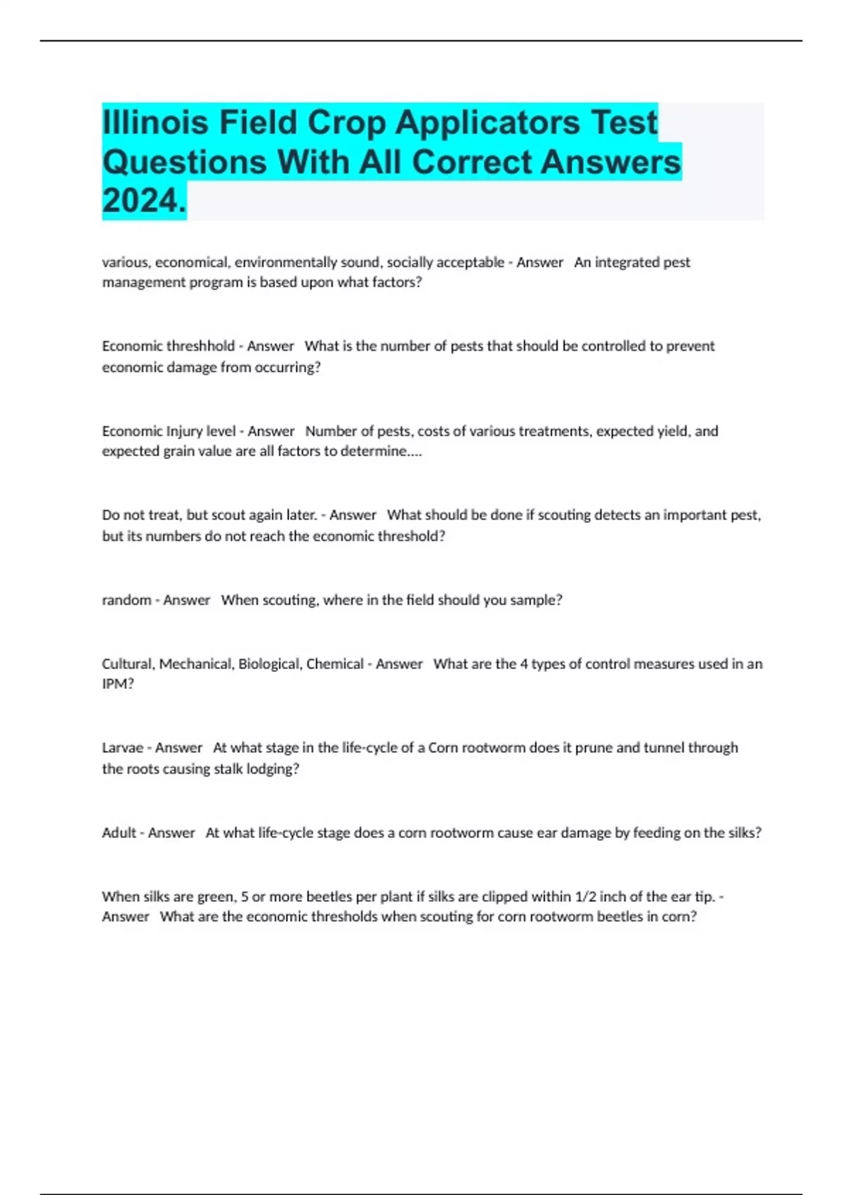 Illinois Field Crop Applicators Test Questions With All Correct Answers 2024.