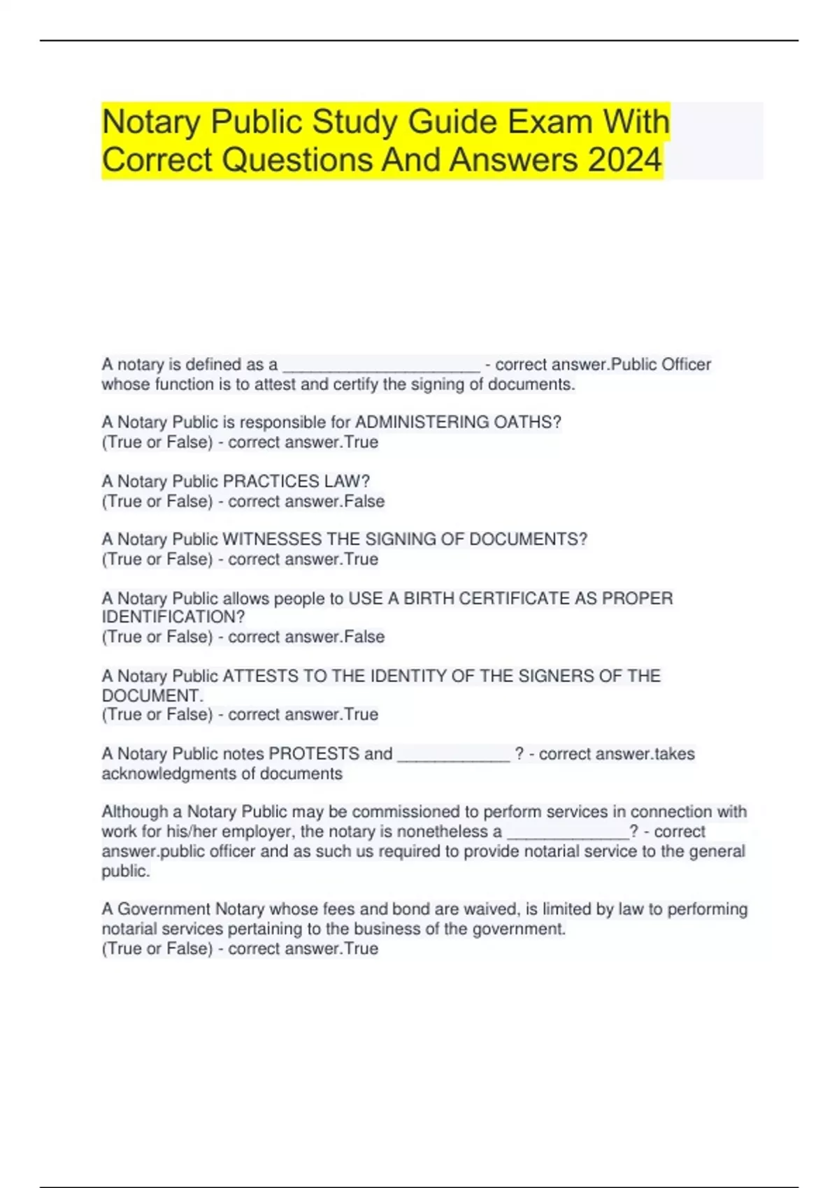 Notary Public Study Guide Exam With Correct Questions And Answers 2024 A notary is defined as a _____________________ - correct answer.Public Officer whose function is to attest and certify the signing of documents. A Notary Public is responsible for ADMINISTERING OATHS? (True or False) - correct answer.True A Notary Public PRACTICES LAW? (True or False) - correct answer.False A Notary Public WITNESSES THE SIGNING OF DOCUMENTS? (True or False) - correct answer.True A Notary Public allows people to USE A BIRTH CERTIFICATE AS PROPER IDENTIFICATION? (True or False) - correct answer.False A Notary Public ATTESTS TO THE IDENTITY OF THE SIGNERS OF THE DOCUMENT. (True or False) - correct answer.True A Notary Public notes PROTESTS and ____________ ? - correct acknowledgments of documents Although a Notary Public may be commissioned to perform services in connection with work for his/her employer, the notary is nonetheless a _____________? - correct c officer and as such us required to provide notarial service to the general public. A Government Notary whose fees and bond are waived, is limited by law to performing notarial services pertaining to the business of the government. (True or False) - correct answer.True At what point does a Government Notary perform notarial services outside of business of the government? - correct answer.Where the occasion is deemed by the head of the department of the governmental unit to be of URGENT NECESSITY and CONVENIENCE. In Hawaii, to be eligible for a notary public commission, the applicant must be: (List 3 Requirements) - correct answer.A U.S. citizen; Hawaii Resident; and at least 18 years of age. Application for a Notary Public Commission is made on forms provided by: - correct Attorney General. After approval of an applicant by the Attorney General, the applicant is required to take a written closed-book examination covering the ___________ _____ and _____________ _____________ that apply to notaries public. - correct answer.Statutory laws; Administrative Rules What is the passing score on the written examination for Notary Public Commission? - correct answer.80 Percent The Attorney General may, in the Attorney General's discretion, appoint and commission such number of notaries public for the State as the Attorney General deems necessary for the public good and convenience. (True or False) - correct answer.True What is the term of office of a Notary Public? - correct answer.Four Years When does ones Notary Public Commission expire? - correct answer.Four Years from the date of the notary's commission. Can the Attorney General remove or revoke ones commission at any time? (True or False) - correct answer.True Each notary shall, upon ANY CHANGES in the notary's office, occupation, residence, or employment, report the same in writing to the Attorney General within ______ days of the change. - correct answer.30 Each Notary Public shall be responsible for renewing the Notary Public's commission on a timely basis and satisfying the renewal requirements provided by law. (True or False) - correct answer.True The failure to renew a commission in a timely manner may cause the commission to be __________, if the Attorney General finds that the failure was done knowingly. - correct answer.Forfeited The commission of a Notary Public is forfeited if the Notary Public __________ fails to submit a completed renewal application, pay the renewal fee, or complete the processing and filing of a new commission for renewal by the date of expiration of the Notary Public's commission. - correct answer.Knowingly The commission of a Notary Public is forfeited if the Notary Public knowingly fails to submit a completed renewal application, pay the renewal fee, or complete the processing and filing of a new commission for renewal by the date of __________ of the Notary Public's commission. - correct answer.Expiration Any Notary seeking to restore the notary's forfeited commission more than _________ from the date of expiration of the commission shall reapply as a new applicant for a notary public commission. - correct year Any Notary seeking to restore the notary's forfeited commission more than one year from the date of expiration of the commission shall ______ __ _ ____ ________ for a notary public commission. - correct ly as a new applicant The Attorney General subject to chapter 91, Hawaii Revised Sautes (HRS), may prescribe such rules as the Attorney General deems advisable concerning the administration of chapter 456, HRS, the appointment and duties of notaries public, and the duties of other officers there under. (True or False) - correct answer.True When was the Chapter 5-11, Hawaii Administrative Rules (HAR), governing the practices and procedures of notaries commissioned in Hawaii, adopted? - correct answer.May 5, 2008 Each notary is required to obtain, at the expense of the notary or the notary's company, and shall constantly keep either an _______ ___ __ ____or a rubber stamp facsimile seal. - correct ved seal of office Each notary is required to obtain, at the expense of the notary or the notary's company, and shall constantly keep either an engraved seal of office or a ____ ____ ______ _____ . - correct r stamp facsimile seal Notarial seals must be ___________ in shape. - correct lar Notarial seals must be no larger than _______________ in diameter. - correct answer.2 inches List (4) items that are required to be on the Notarial seal. - correct answer.1. the Notary's name 2. commission number 3. "State of Hawaii" 4. "Notary Public"