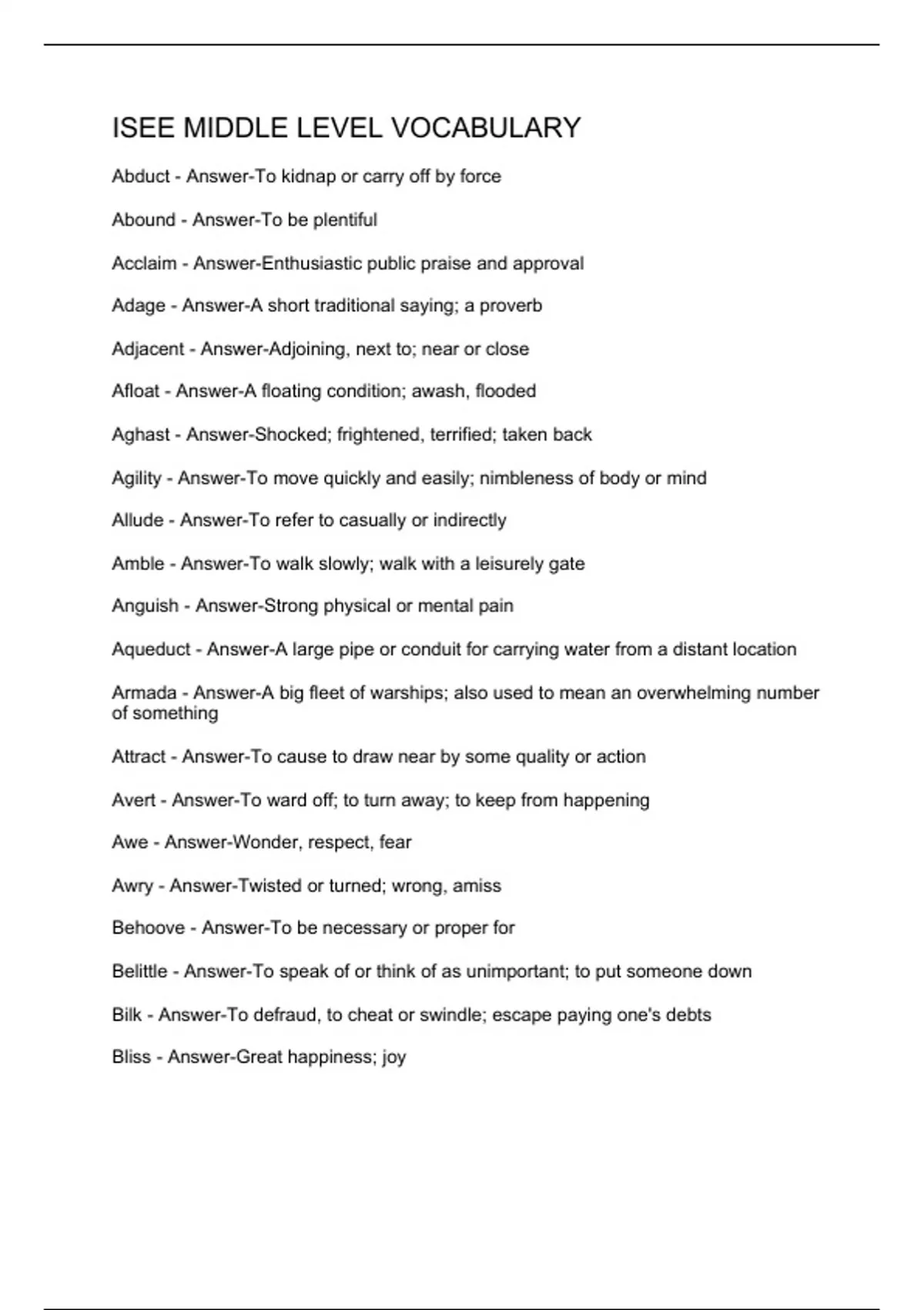 Abduct - Answer-To kidnap or carry off by force Abound - Answer-To be plentiful Acclaim - Answer-Enthusiastic public praise and approval Adage - Answer-A short traditional saying; a proverb Adjacent - Answer-Adjoining, next to; near or close Afloat - Answer-A floating condition; awash, flooded Aghast - Answer-Shocked; frightened, terrified; taken back Agility - Answer-To move quickly and easily; nimbleness of body or mind Allud