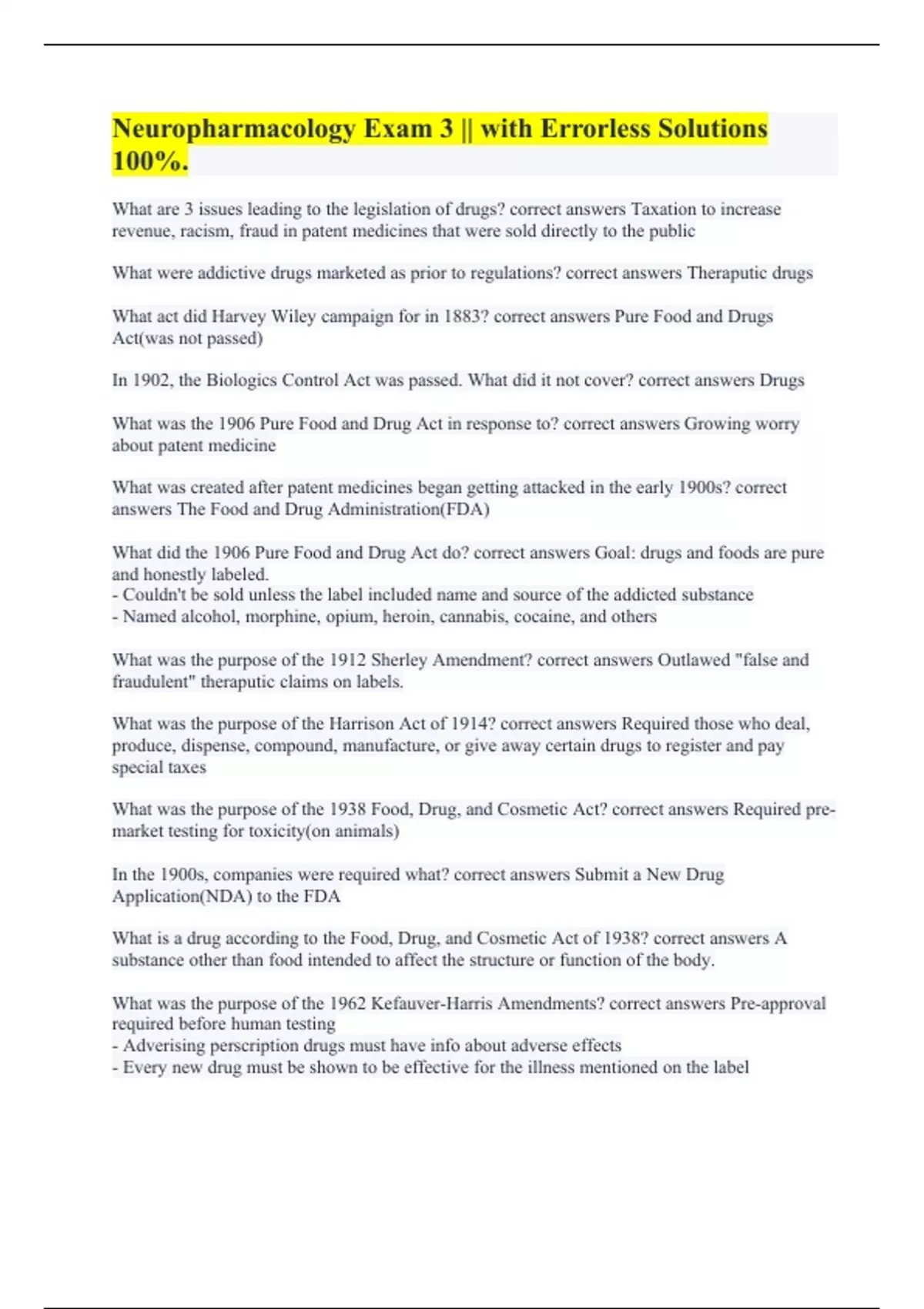 What are 3 issues leading to the legislation of drugs? correct answers Taxation to increase revenue, racism, fraud in patent medicines that were sold directly to the public What were addictive drugs marketed as prior to regulations? correct answers Theraputic drugs What act did Harvey Wiley campaign for in 1883? correct answers Pure Food and Drugs Act(was not passed) In 1902, the Biologics Control Act was passed. What did it not cover? correct answers Drugs What was the 1906 Pure Food and Drug Act in response to? correct answers Growing worry about patent medicine What was created after patent medicines began getting attacked in the early 1900s? correct answers The Food and Drug Administration(FDA) What did the 1906 Pure Food and Drug Act do? correct answers Goal: drugs and foods are pure and honestly labeled. - Couldn't be sold unless the label included name and source of the addicted substance - Named alcohol, morphine, opium, heroin, cannabis, cocaine, and others What was the purpose of the 1912 Sherley Amendment? correct answers Outlawed "false and fraudulent" theraputic claims on labels. What was the purpose of the Harrison Act of 1914? correct answers Required those who deal, produce, dispense, compound, manufacture, or give away certain drugs to register and pay special taxes What was the purpose of the 1938 Food, Drug, and Cosmetic Act? correct answers Required pre-market testing for toxicity(on animals) In the 1900s, companies were required what? correct answers Submit a New Drug Application(NDA) to the FDA What is a drug according to the Food, Drug, and Cosmetic Act of 1938? correct answers A substance other than food intended to affect the structure or function of the body. What was the purpose of the 1962 Kefauver-Harris Amendments? correct answers Pre-approval required before human testing - Adverising perscription drugs must have info about adverse effects - Every new drug must be shown to be effective for the illness mentioned on the label