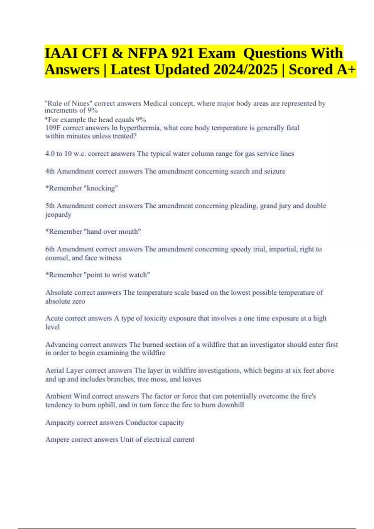IAAI CFI & NFPA 921 Exam Questions With Answers Latest Updated 2024/2025 | Graded A+. "Rule of Nines" correct answers Medical concept, where major body areas are represented by increments of 9% *For example the head equals 9% 109F correct answers In hyperthermia, what core body temperature is generally fatal within minutes unless treated? 4.0 to 10 w.c. correct answers The typical water column range for gas service lines 4th Amendment correct answers The amendment concerning search and seizure *Remember "knocking" 5th Amendment correct answers The amendment concerning pleading, grand jury and double jeopardy *Remember "hand over mouth" 6th Amendment correct answers The amendment concerning speedy trial, impartial, right to counsel, and face witness *Remember "point to wrist watch" Absolute correct answers The temperature scale based on the lowest possible temperature of absolute zero Acute correct answers A type of toxicity exposure that involves a one time exposure at a high level Advancing correct answers The burned section of a wildfire that an investigator should enter first in order to begin examining the wildfire Aerial Layer correct answers The layer in wildfire investigations, which begins at six feet above and up and includes branches, tree moss, and leaves Ambient Wind correct answers The factor or force that can potentially overcome the fire's tendency to burn uphill, and in turn force the fire to burn downhill Ampacity correct answers Conductor capacity Ampere correct answers Unit of electrical current IAAI CFI & NFPA 921 Exam Questions With Answers | Latest Updated 2024/2025 | Scored A+ Arc correct answers Luminous electrical discharge across a gap Arc Mapping correct answers An electrical analysis that is fundamentally pattern recognition Arcing correct answers An electrical event that is typically too brief and localized to be a competent ignition source Arson correct answers From the standpoint of investigative preparation, documentation, and scene control etc., every fire should be approached as if it is potentially what type of fire? Arson Motives correct answers Vandalism, excitement, revenge, crime concealment, profit, extremism, and pyromania are seven types of what? ASTM E1618 correct answers What standard governs evidence collection for accelerant testing? Auto-ignition Temperature correct answers The minimum temperature at which combustible substance ignites without spark or flame Axisymmetric Plume correct answers A fire plume in the center of the room with no wall interface Backdraft correct answers A low-order explosion that is the result of an oxygen-depleted fire that produces high concentrations of incomplete combustion products, with a sudden mixture of air into the accumulated fuels Battery correct answers The only source of electricity in a vehicle when the engine is not running Blast Pressure Front correct answers The expanding leading edge of explosion reaction, which is primarily responsible for explosion damage and injuries BLEVE correct answers The most frequently encountered mechanical explosion BLEVE correct answers An event that occurs when a vessel's contents are liquid and heating causes the liquid to exceed its boiling point and failure of the vessel occurs Rapid Boiling correct answers This is the mechanism in a Mechanical Explosion, along with the expansion of pressurized gas Bow correct answers The front of a boat Breaker Panel correct answers In an electrical system, this device primarily functions as a main cutoff, electrical protection, and power distribution Buoyant Force correct answers A force that is generated by temperature differences *Due to hot air rising because its less dense Buoyant Force correct answers Fire plumes, ceiling jets and vent flows are examples of what type of force at work during a fire? Cable Staple correct answers This structural component cannot be driven through insulation when properly installed 252 Calories & 1055 Joules correct answers One BTU is equal to ________ calories *Which is equal to _________ Joules Carbon Dioxide correct answers A type of suppression agent that is effective because it is noncorrosive, residue-less, non-conductive, and universally useful on most combustibles Carbon Monoxide correct answers Binds with hemoglobin in the blood approximately 250 times greater than oxygen Cascading correct answers Another name for a secondary or subsequent explosion Catalytic Convertor and Turbocharger correct answers Name the other two hottest components in a vehicle, other than the exhaust system. Changed or Transferred correct answers One law of energy says that energy can not be created or destroyed; but can only be what? Chemical Explosion correct answers Flammable gases, vapors of ignitable liquids, combustible dusts, backdraft explosion, and aerosols are examples of fuels often involved in what type of explosion? Chronic correct answers A type of toxicity exposure that involves a low-level of continuous exposure Closed correct answers The type of electrical system that involves a current flowing in a loop or complete circuit. Combustibles correct answers These materials produce essentially the same flame temperature as ignitable liquids. Combustion correct answers A rapid oxidation process, as opposed to slow oxidation Commercial Propane correct answers A type of gas that is liquefied under pressure for storage and is heavier than air (1.5 to 2.0 vapor density) Condensed-Phase Explosive correct answers A solid explosive that is characterized by high pressures, crushing effects, and typically pronounced seats Condensed-Phase Explosion correct answers Explosions involving a solid--as opposed to a diffuse fuel--in which the fuel and oxidizer is mechanically mixed or the material itself can be rapidly and molecularly converted Conductors correct answers These provide a pathway for current to flow in an electrical system Congestion and Confinement correct answers These two conditions are essential for
