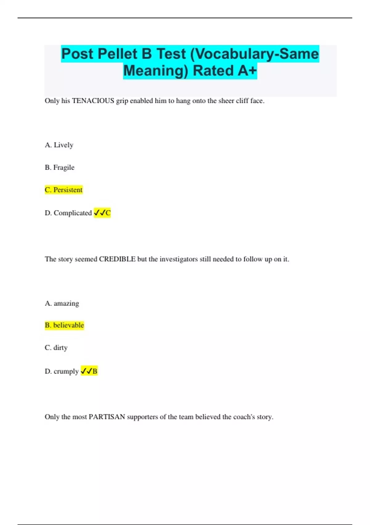 Post Pellet B Test (Vocabulary-Same Meaning) Rated A+ Only his TENACIOUS grip enabled him to hang onto the sheer cliff face. A. Lively B. Fragile C. Persistent D. Complicated C The story seemed CREDIBLE but the investigators still needed to follow up on it. A. amazing B. believable C. dirty D. crumply B Only the most PARTISAN supporters of the team believed the coach's story. A. ignorant B. uninterested C. festive D. supporter D The PREMISE of the movie was that time travel had become common and affordable. A. argument B. conclusion C. decision D. thought A A police officer who excels at her job may receive an ACCOLADE from the local media. A. drama B. compliment C. feature D. deadline B He seemed to be in PERPETUAL motion without ever getting anything done. A. timed B. mobile C. continuous D. inconstant C An administrative oversight made it necessary for him to RESCIND the original oversight. A. invalidate B. put back C. create D. allege A He installed a solar panel so that he could GENERATE some of his own electricity. A. annoy B. select C. enjoy D. produce D Sometimes even the most INCOMPATIBLE partners can complete some excellent work. A. agreeable B. conflicting C. friendly D. compliant B His material PROSPERITY did not compensate