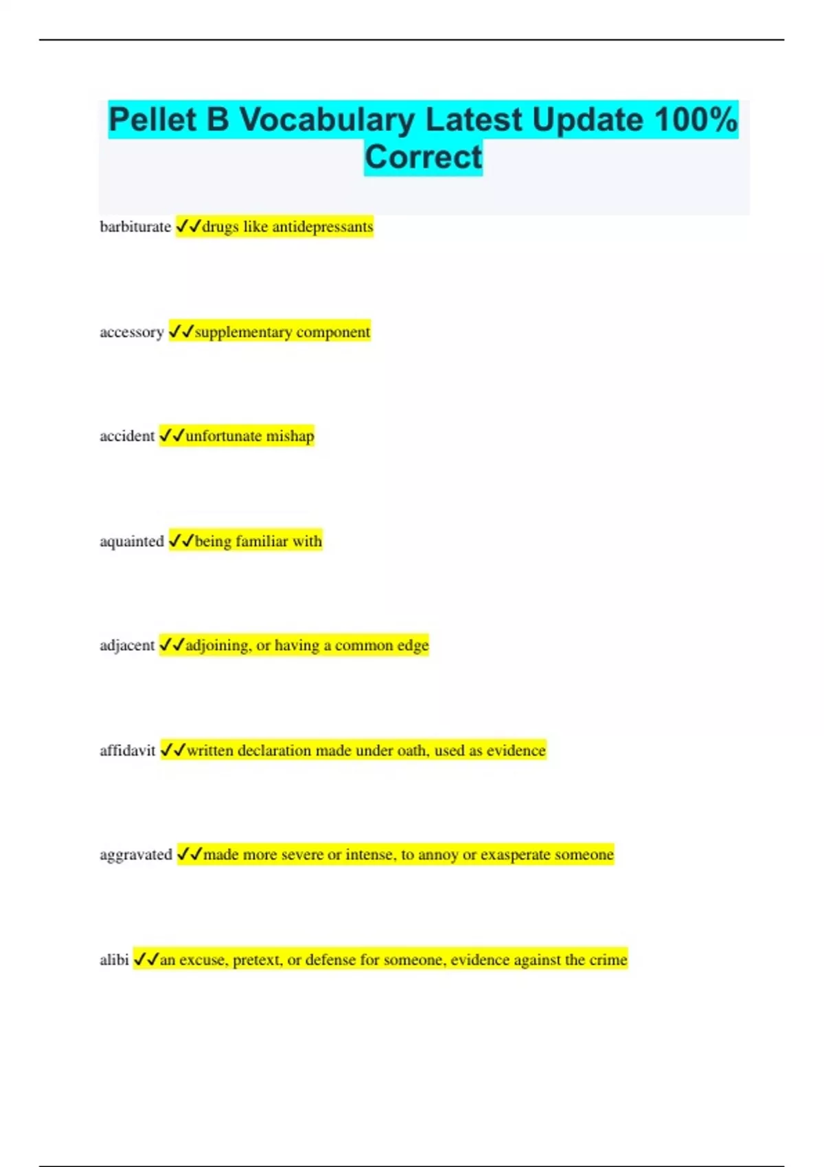 Pellet B Vocabulary Latest Update 100% Correct barbiturate drugs like antidepressants accessory supplementary component accident unfortunate mishap aquainted being familiar with adjacent adjoining, or having a common edge affidavit written declaration made under oath, used as evidence aggravated made more severe or intense, to annoy or exasperate someone alibi an excuse, pretext, or defense for someone, evidence against the crime alleged doubtful or suspect analysis detailed examination or investigation apparent clearly visible or understood; obvious arraign accuse of wrong doing; censure, prosecute censure formal disapproval; condemnation belligerent hostile or aggressive conscientious characterized by extreme care or great effort; careful or diligent contusion bruise corroborate confirm, verify, or give support to; endorse counterfeit fake or fraud defamation abusive attack on someones character; libel or slander libel published false statement that is damaging to a persons reputation; defamation deterrent something interfering with an action or progress; discourage malicious intending to do harm; spiteful