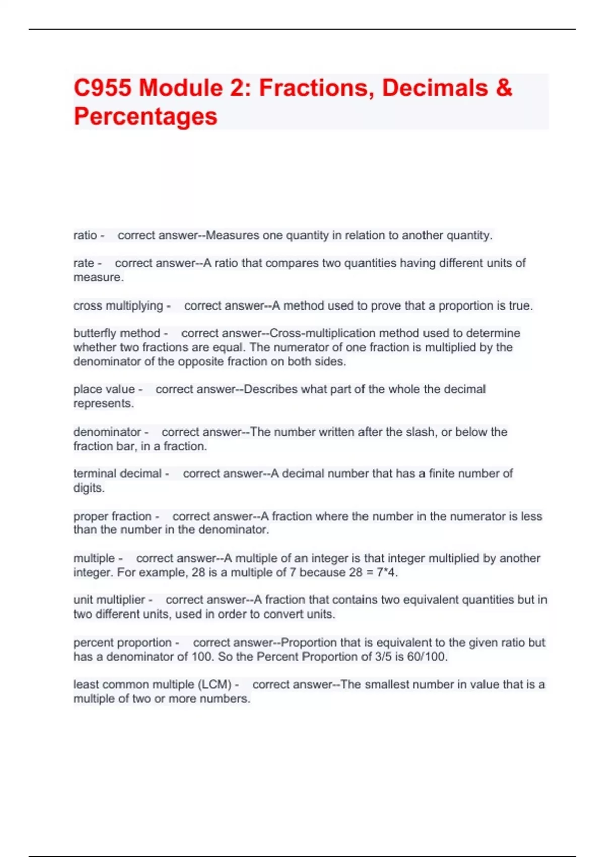 ratio - correct answer--Measures one quantity in relation to another quantity. rate - correct answer--A ratio that compares two quantities having different units of measure. cross multiplying - correct answer--A method used to prove that a proportion is true. butterfly method - correct answer--Cross-multiplication method used to determine whether two fractions are equal. The numerator of one fraction is multiplied by the denominator of the opposite fraction on both sides. place value - correct answer--Describes what part of the whole the decimal represents. denominator - correct answer--The number written after the slash, or below the fraction bar, in a fraction. terminal decimal - correct answer--A decimal number that has a finite number of digits. proper fraction - correct answer--A fraction where the number in the numerator is less than the number in the denominator. multiple - correct answer--A multiple of an integer is that integer multiplied by another integer. For example, 28 is a multiple of 7 because 28 = 7*4. unit multiplier - correct answer--A fraction that contains two equivalent quantities but in two different units, used in order to convert units. percent proportion - correct answer--Proportion that is equivalent to the given ratio but has a denominator of 100. So the Percent Proportion of 3/5 is 60/100. least common multiple (LCM) - correct answer--The smallest number in value that is a multiple of two or more numbers.