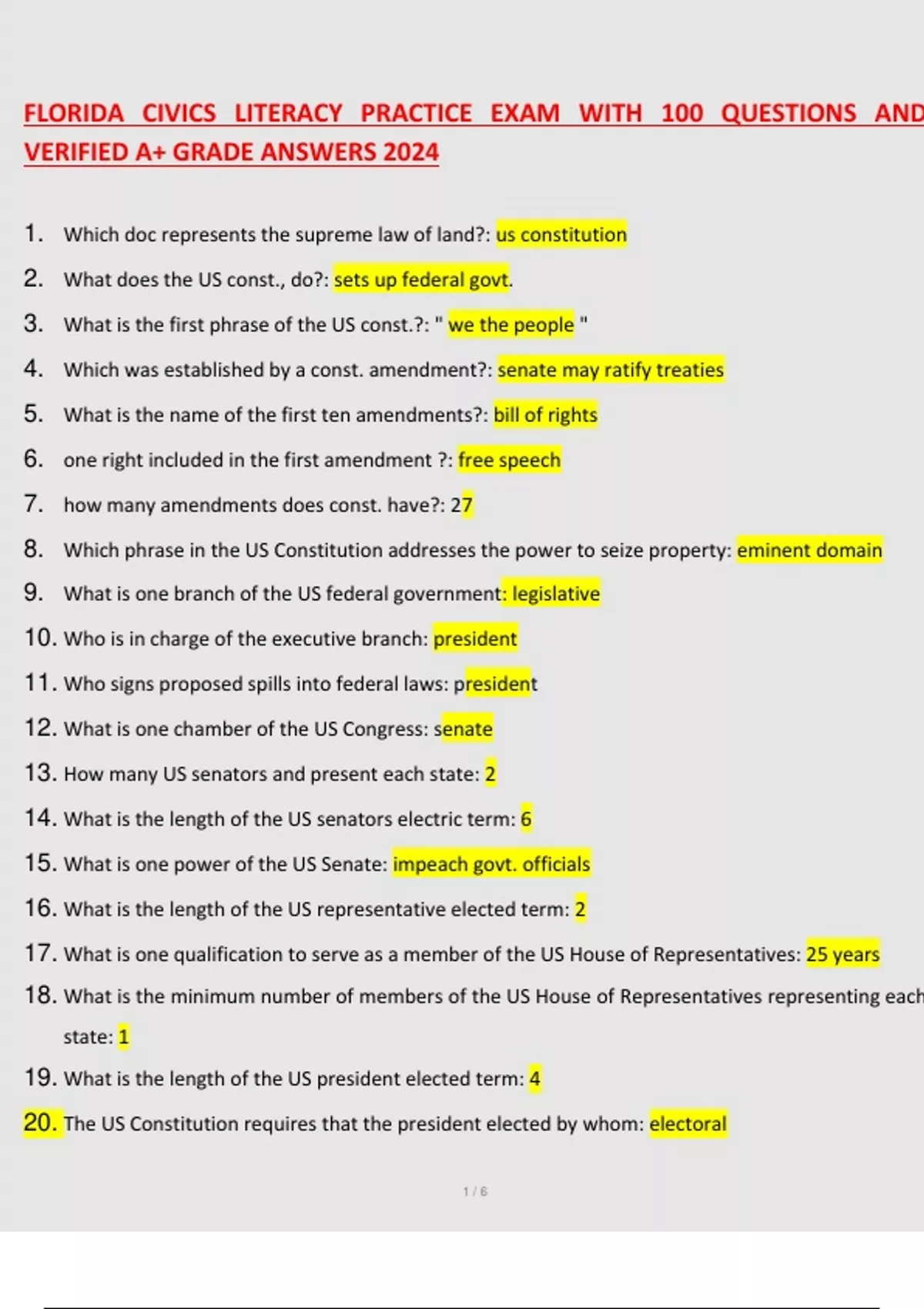 FLORIDA CIVICS LITERACY PRACTICE EXAM WITH 100 QUESTIONS AND VERIFIED A+ GRADE ANSWERS 2024