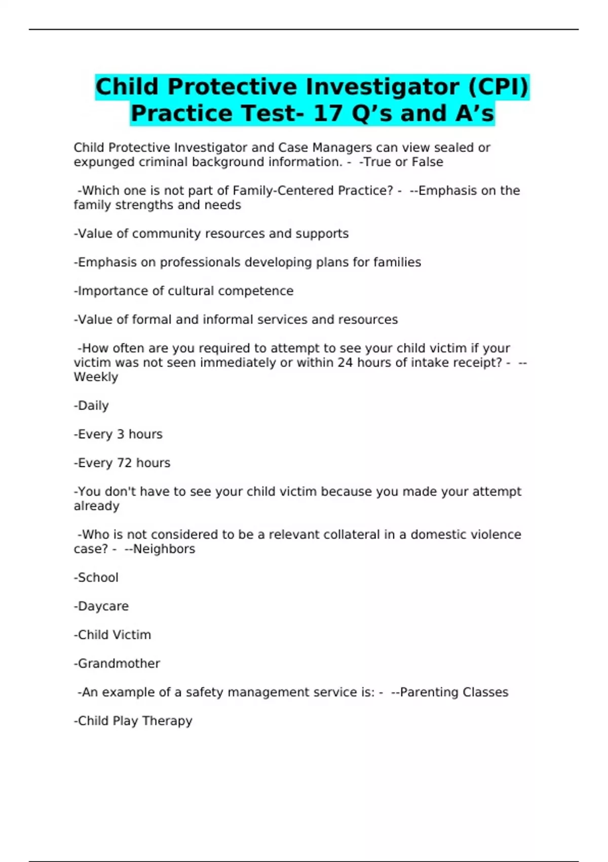 Child Protective Investigator (CPI) Practice Test- 17 Q’s and A’s