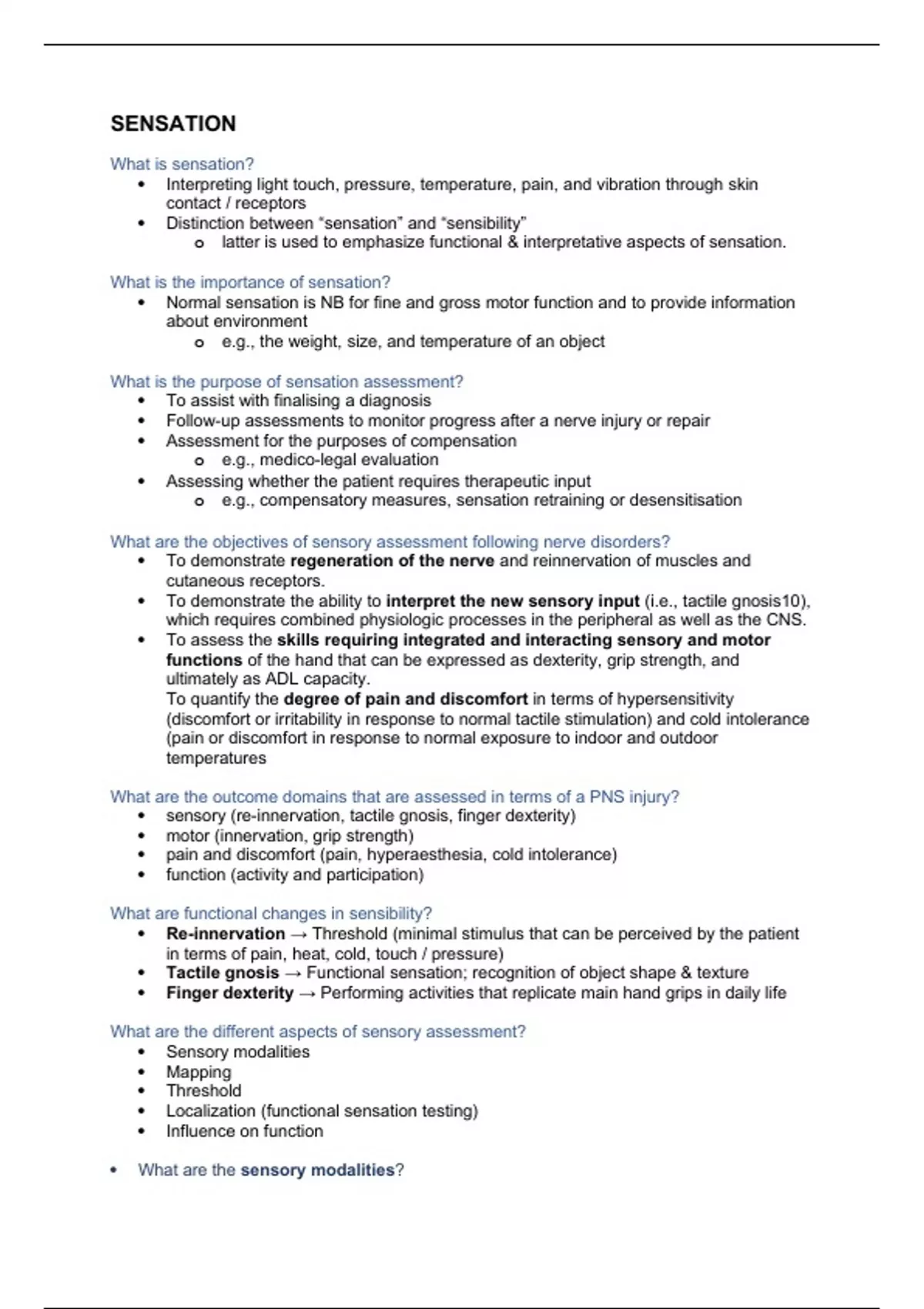 Highly detailed summary of the content for all the Sensation Assessment lectures. Includes work from lecture slides, textbook/reading annotations and external research where further explanation was needed.