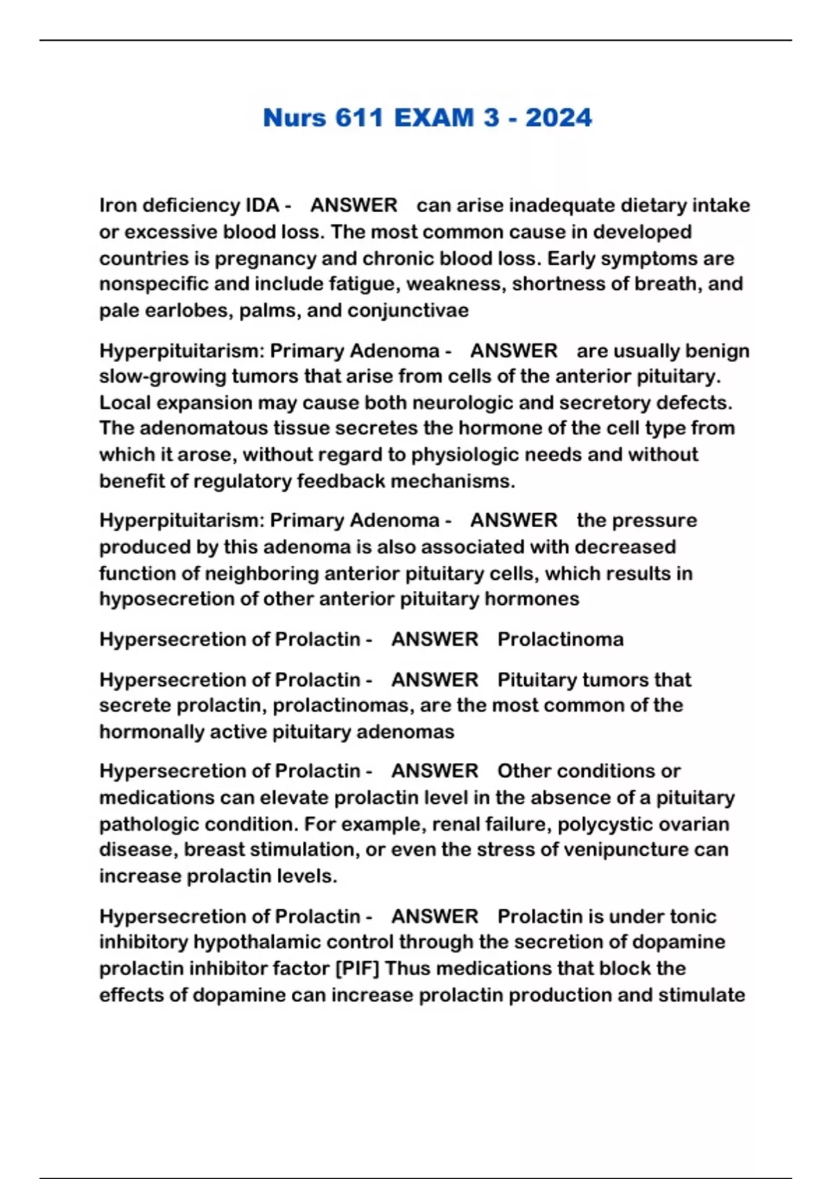 Hypersecretion of Prolactin - ANSWER Prolactinoma