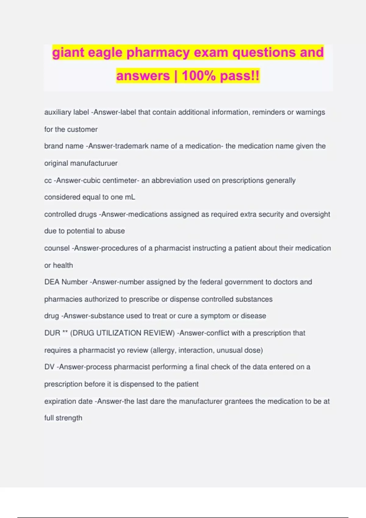 giant eagle pharmacy exam questions and answers | 100% pass!! auxiliary label -Answer-label that contain additional information, reminders or warnings for the customer brand name -Answer-trademark name of a medication- the medication name given the original manufacturuer cc -Answer-cubic centimeter- an abbreviation used on prescriptions generally considered equal to one mL controlled drugs -Answer-medications assigned as required extra security and oversight due to potential to abuse counsel -Answer-procedures of a pharmacist instructing a patient about their medication or health DEA Number -Answer-number assigned by the federal government to doctors and pharmacies authorized to prescribe or dispense controlled substances drug -Answer-substance used to treat or cure a symptom or disease DUR ** (DRUG UTILIZATION REVIEW) -Answer-conflict with a prescription that requires a pharmacist yo review (allergy, interaction, unusual dose) DV -Answer-process pharmacist performing a final check of the data entered on a prescription before it is dispensed to the patient expiration date -Answer-the last dare the manufacturer grantees the medication to be at full strength facing the shelves -Answer-process of moving goods to the edge of shelves with the fronts facing outward generic name -Answer-a name used to identify a drug other than the brand name- multiple manufacturers can make products with the same generic name gram -Answer-most common measurement for creams, ointments, and other applied medications dea license -Answer-requires by a state regulatory board to prescribe or dispense controlled substances lot number -Answer-identification number that allows manufacturer to identify the specific batch of a medication HIPAA -Answer-law passed in 1996 that ensures patient privacy of all protected health information iu -Answer-internation unit- a measurement for some vitamins mostly vitamin d mg milligram -Answer-most common measurement for capsules and tablets ml milliliter -Answer-most common measurement for the quantity to dispense of liquid medication ndc -Answer-11 digit identifying number on every medication that specifies the manufacturer, drug and bottle sizw ophthalmic -Answer-referring to the eye otic -Answer-referring to ear pv -Answer-process of the pharmacist performing a final check of the produce before it get dispense to patient