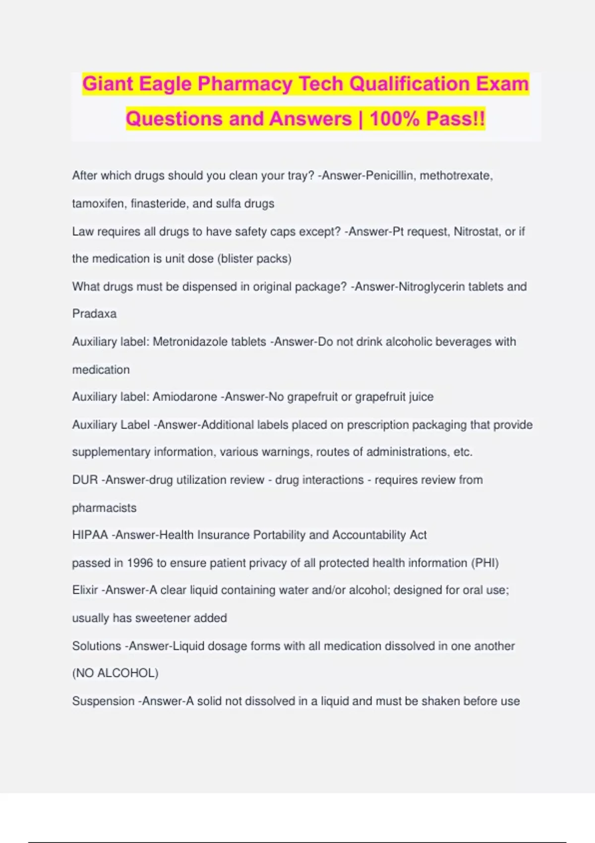 Giant Eagle Pharmacy Tech Qualification Exam Questions and Answers | 100% Pass!! After which drugs should you clean your tray? -Answer-Penicillin, methotrexate, tamoxifen, finasteride, and sulfa drugs Law requires all drugs to have safety caps except? -Answer-Pt request, Nitrostat, or if the medication is unit dose (blister packs) What drugs must be dispensed in original package? -Answer-Nitroglycerin tablets and Pradaxa Auxiliary label: Metronidazole tablets -Answer-Do not drink alcoholic beverages with medication Auxiliary label: Amiodarone -Answer-No grapefruit or grapefruit juice Auxiliary Label -Answer-Additional labels placed on prescription packaging that provide supplementary information, various warnings, routes of administrations, etc. DUR -Answer-drug utilization review - drug interactions - requires review from pharmacists HIPAA -Answer-Health Insurance Portability and Accountability Act passed in 1996 to ensure patient privacy of all protected health information (PHI) Elixir -Answer-A clear liquid containing water and/or alcohol; designed for oral use; usually has sweetener added Solutions -Answer-Liquid dosage forms with all medication dissolved in one another (NO ALCOHOL) Suspension -Answer-A solid not dissolved in a liquid and must be shaken before use Transdermal -Answer-A topical system designed to release medication into the body through the skin (usually used for extended release) Co-pay -Answer-the amount of money the patient has to pay that the insurance company will not pay Deductible -Answer-The amount the patient must pay before the insurer will cover additional medical expenses MAC -Answer-the maximum allowable cost that an insurer will pay per tablet or dispensing unit for a given product (coverage gap) Ohio law for selecting DAW on a script (so that brand name will be dispensed) -Answer- The designation must be handwritten on a hard copy prescription, signature does not count Biggest advantage of online billing -Answer-Getting a rejected claim immediately so it can be fixed before dispensing the med to the pt ad -Answer-right ear od -Answer-right eye as -Answer-left ear os -Answer-left eye UAD or UD -Answer-As directed ung -Answer-ointment Compounding (2) -Answer-Conversion of one dose to another, distilled water to a order to make a liquid Preparation of selected dosage forms from bulk chemicals, recipe from a doctor to make a product that isn't commercially available When labeling a package item never cover what? (3) -Answer-NDC, Expiration, lot number Aerosols -Answer-Liquid or gaseous medications deliver via spray Ampules -Answer-Sterile containers containing a single dose of medication Caplets -Answer-Tablets shaped similar to a capsule Cream -Answer-A topical dosage, semi solid, oil and water Gel -Answer-Semi solid, usually water, small particles, also Calle colloidal suspensions Lotion -Answer-Fluid emulsion or suspension intended for external use gtts -Answer-Drops When compounding technicians may -Answer-Calculate ingredients and measure ingredients, but pharmacists must check your work before combining anything Weighing paper -Answer-Allows for easy transfer of the active pharmaceutical ingredients Trituration -Answer-The process of decreasing the particle size by grinding - decreases particle size Levigation -Answer-Dissolving solid ingredients into an ointment or cream by mixing together & pressing hard with spatula on a glass plate - decreases particle size 1 teaspoon = ? Ml -Answer-5 mL Is it acceptable to use as directed to calculate the day supply? -Answer-No, may only use on prepackaged meds (like Z-Pak) where the manufacturer provides printed directions 1 oz = ? Ml -Answer-30 mL 1ml = ? Drops -Answer-20 drop