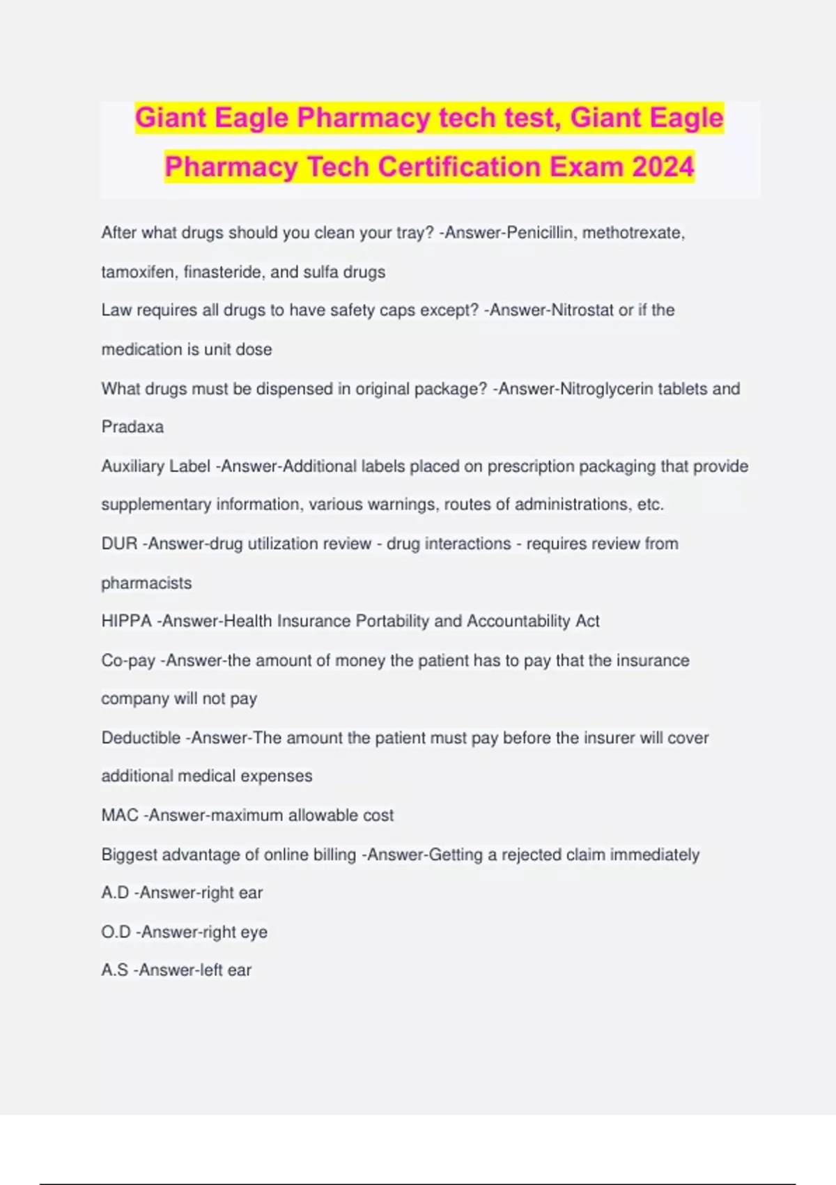 Giant Eagle Pharmacy tech test, Giant Eagle Pharmacy Tech Certification Exam 2024 After what drugs should you clean your tray? -Answer-Penicillin, methotrexate, tamoxifen, finasteride, and sulfa drugs Law requires all drugs to have safety caps except? -Answer-Nitrostat or if the medication is unit dose What drugs must be dispensed in original package? -Answer-Nitroglycerin tablets and Pradaxa Auxiliary Label -Answer-Additional labels placed on prescription packaging that provide supplementary information, various warnings, routes of administrations, etc. DUR -Answer-drug utilization review - drug interactions - requires review from pharmacists HIPPA -Answer-Health Insurance Portability and Accountability Act Co-pay -Answer-the amount of money the patient has to pay that the insurance company will not pay Deductible -Answer-The amount the patient must pay before the insurer will cover additional medical expenses MAC -Answer-maximum allowable cost Biggest advantage of online billing -Answer-Getting a rejected claim immediately A.D -Answer-right ear O.D -Answer-right eye A.S -Answer-left ear O.S -Answer-left eye UAD or UD -Answer-As directed When labeling a package item never cover what? (3) -Answer-NDC, Expiration, lot number When compounding technicians may -Answer-Calculate ingredients and measure ingredients, but pharmacists must check your work before combining anything 1 teaspoon = ? Ml -Answer-5 mL Is it acceptable to use as directed to calculate the day supply? -Answer-No 1 oz = ? Ml -Answer-30 mL 1ml = ? Drops -Answer-20 drops Root Cause Analysis (2) -Answer-Document the QRE or incident and Investigate where the process broke down Class II recall -Answer-A drug that is under-strength but is not used to treat life- threatening situations. Consequence is remote. Class I recall -Answer-Label mix-up. Serious consequences or death. Class III recall -Answer-A minor container defect. Not likely to cause a consequence The pharmacist must preform a prospective drug utilization review including (2) - Answer-Duplicate therapies. Drug-drug and drug-allergy interactions. How long are prescriptions for acute pain valid for ? -Answer-14 days Controlled substances must be prescribed in ? -Answer-Numerical and alphabetical form A prescription for an animal must contain? -Answer-Label must have animals and owners name. If a compound must indicate. OBRA -Answer-Omnibus Budget Reconciliation Act - counseling Medicare hard copy prescriptions must be stored for how many years? -Answer-10 years Al records must be kept for how long? -Answer-3 years If the prescription record is older than 12 months, how many days do we comply to any request ? -Answer-3 days The inventory must be completed either as ? -Answer-Opening or close of business Immunizations must include the following when stored? -Answer-Full name, address. Name, strength and dose of immunization. Lot number a
