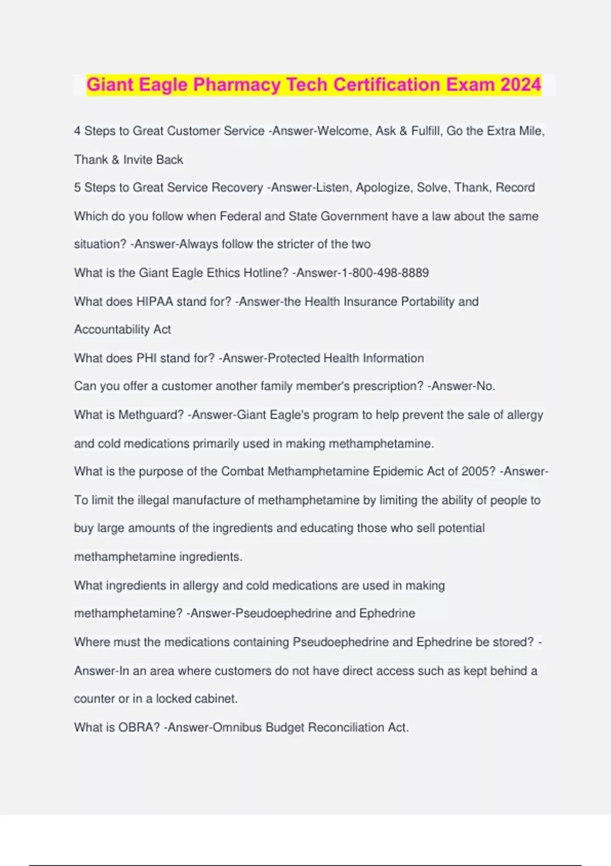 Giant Eagle Pharmacy Tech Certification Exam 2024 4 Steps to Great Customer Service -Answer-Welcome, Ask & Fulfill, Go the Extra Mile, Thank & Invite Back 5 Steps to Great Service Recovery -Answer-Listen, Apologize, Solve, Thank, Record Which do you follow when Federal and State Government have a law about the same situation? -Answer-Always follow the stricter of the two What is the Giant Eagle Ethics Hotline? -Answer- What does HIPAA stand for? -Answer-the Health Insurance Portability and Accountability Act What does PHI stand for? -Answer-Protected Health Information Can you offer a customer another family member's prescription? -Answer-No. What is Methguard? -Answer-Giant Eagle's program to help prevent the sale of allergy and cold medications primarily used in making methamphetamine. What is the purpose of the Combat Methamphetamine Epidemic Act of 2005? -Answer- To limit the illegal manufacture of methamphetamine by limiting the ability of people to buy large amounts of the ingredients and educating those who sell potential methamphetamine ingredients. What ingredients in allergy and cold medications are used in making methamphetamine? -Answer-Pseudoephedrine and Ephedrine Where must the medications containing Pseudoephedrine and Ephedrine be stored? - Answer-In an area where customers do not have direct access such as kept behind a counter or in a locked cabinet. What is OBRA? -Answer-Omnibus Budget Reconciliation Act. What is the purpose of OBRA -Answer-To ensure patients have an opportunity to receive counseling about their medications. What are controlled substances / scheduled drugs? -Answer-Drugs with an identified potential for addiction or abuse What are Schedule I drugs? -Answer-Drugs with high potential for abuse and no recognized medical usage. ie: Heroin or LSD What are Schedule II Drugs? -Answer-Drugs with high potential for abuse, but with a recognized medical usage or benefit. ie: Oxycontin, Percocet, Ritalin, and Morphine Schedule II Drugs are often referred to as what? -Answer-Narcotics What are Schedule III-V Drugs? -Answer-Drugs that are treated similarly to to schedule II but may be ordered normally. However, the paper