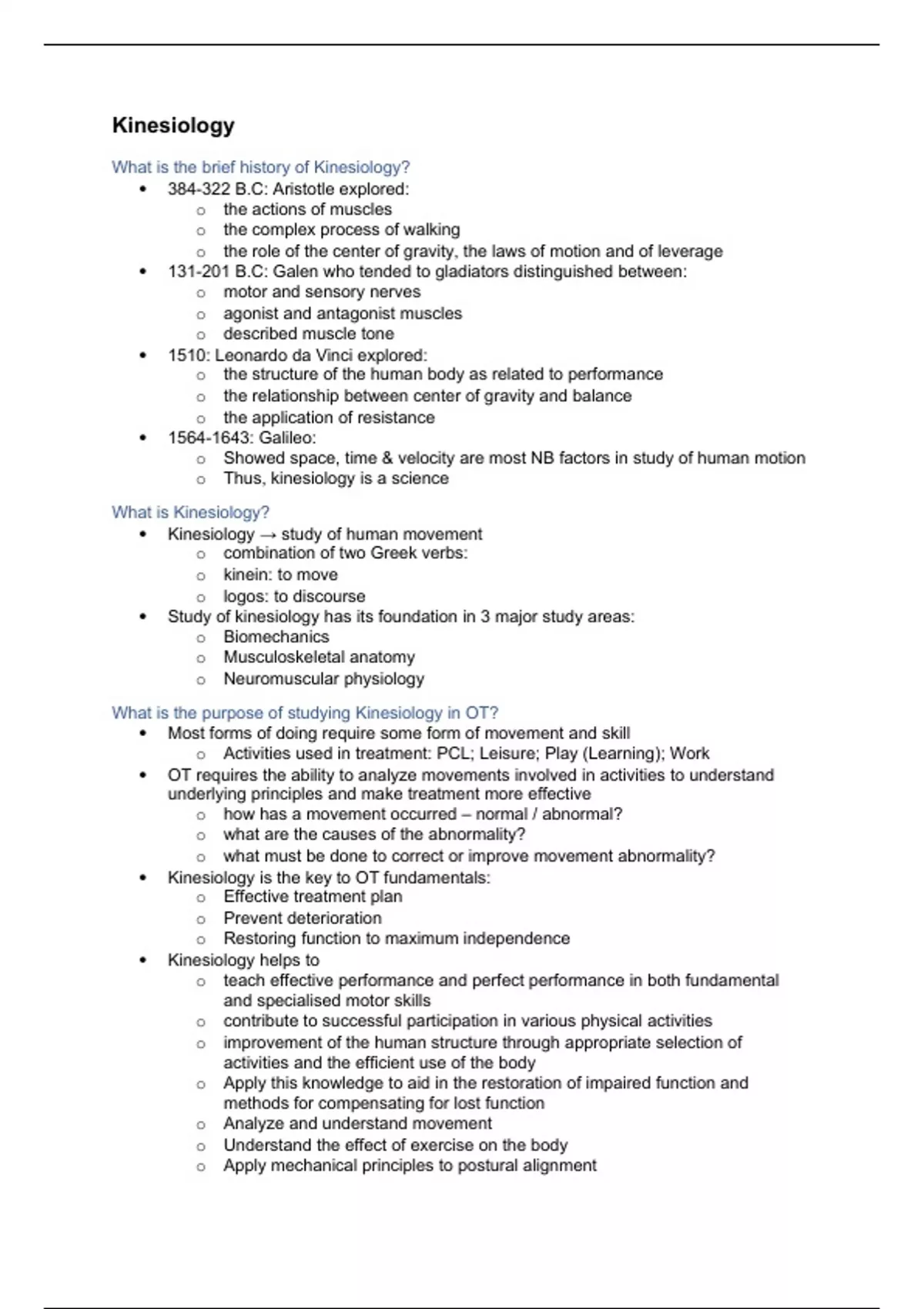 Highly detailed summary of the content for all the Kinesiology lectures. Includes work from lecture slides, textbook/reading annotations and external research where further explanation was needed.
