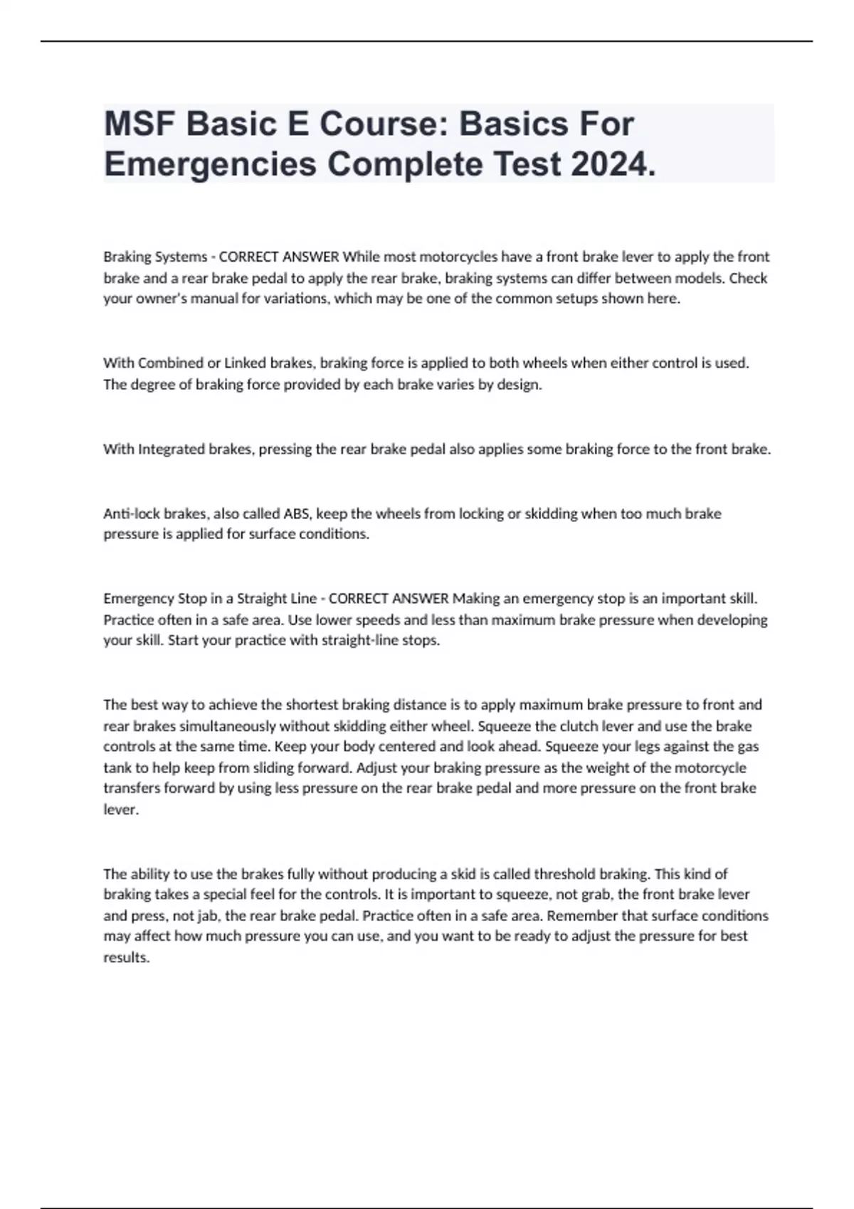 MSF Basic E Course: Basics For Emergencies Complete Test 2024. Braking Systems - CORRECT ANSWER While most motorcycles have a front brake lever to apply the front brake and a rear brake pedal to apply the rear brake, braking systems can differ between models. Check your owner's manual for variations, which may be one of the common setups shown here. With Combined or Linked brakes, braking force is applied to both wheels when either control is used. The degree of braking force provided by each brake varies by design. With Integrated brakes, pressing the rear brake pedal also applies some braking force to the front brake. Anti-lock brakes, also called ABS, keep the wheels from locking or skidding when too much brake pressure is applied for surface conditions. Emergency Stop in a Straight Line - CORRECT ANSWER Making an emergency stop is an important skill. Practice often in a safe area. Use lower speeds and less than maximum brake pressure when developing your skill. Start your practice with straight-line stops. The best way to achieve the shortest braking distance is to apply maximum brake pressure to front and rear brakes simultaneously without skidding either wheel. Squeeze the clutch lever and use the brake controls at the same time. Keep your body centered and look ahead. Squeeze your legs against the gas tank to help keep from sliding forward. Adjust your braking pressure as the weight of the motorcycle transfers forward by using less pressure on the rear brake pedal and more pressure on the front brake lever. The ability to use the brakes fully without producing a skid is called threshold braking. This kind of braking takes a special feel for the controls. It is important to squeeze, not grab, the front brake lever and press, not jab, the rear brake pedal. Practice often in a safe area. Remember that surface conditions may affect how much pressure you can use, and you want to be ready to adjust the pressure for best results.