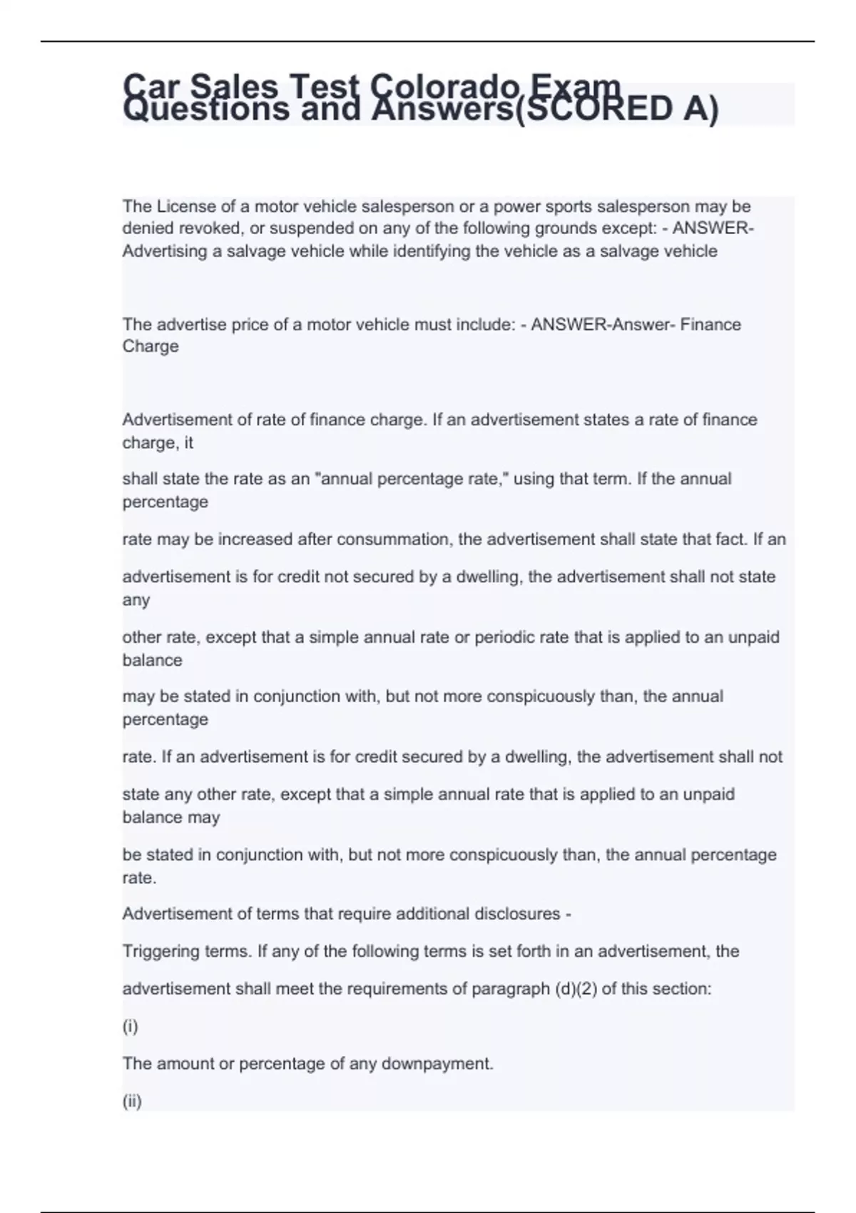 The License of a motor vehicle salesperson or a power sports salesperson may be denied revoked, or suspended on any of the following grounds except: - ANSWER-Advertising a salvage vehicle while identifying the vehicle as a salvage vehicle The advertise price of a motor vehicle must include: - ANSWER-Answer- Finance Charge Advertisement of rate of finance charge. If an advertisement states a rate of finance charge, it shall state the rate as an "annual percentage rate," using that term. If the annual percentage rate may be increased after consummation, the advertisement shall state that fact. If an advertisement is for credit not secured by a dwelling, the advertisement shall not state any other rate, except that a simple annual rate or periodic rate that is applied to an unpaid balance may be stated in conjunction with, but not more conspicuously than, the annual percentage rate. If an advertisement is for credit secured by a dwelling, the advertisement shall not state any other rate, except that a simple annual rate that is applied to an unpaid balance may be stated in conjunction with, but not more conspicuously than, the annual percentage rate. Advertisement of terms that require additional disclosures - Triggering terms. If any of the following terms is set forth in an advertisement, the advertisement shall meet the requirements of paragraph (d)(2) of this section: (i) The amount or percentage of any downpayment. (ii) The number of payments or period of repayment. (iii) The amount of any payment. (iv) The amount of any finance charge. Which of the following is a true statement regarding dealers and buyers - ANSWER-a dealer shall clearly indicate on the customer contract when a vehicle is sold "as-is and without a garantee