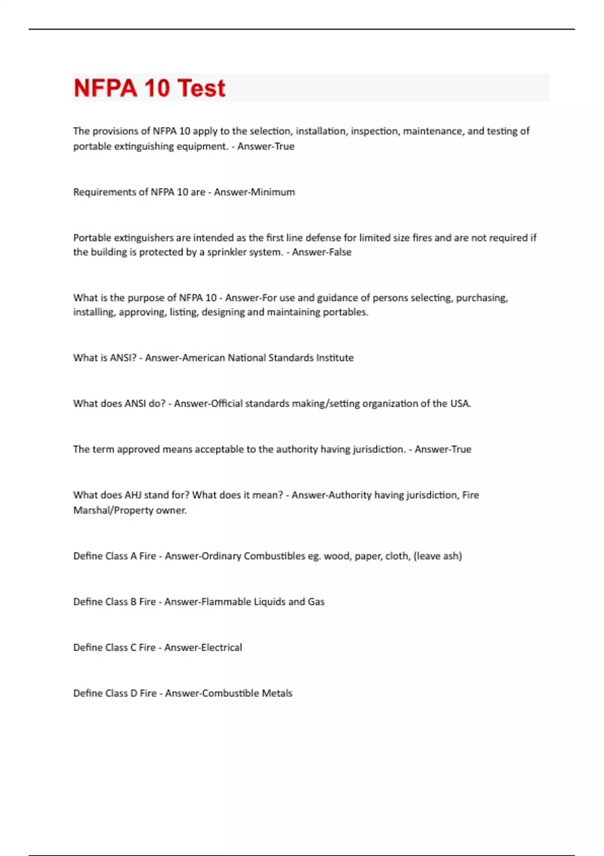 NFPA 10 Test Questions and Answers
