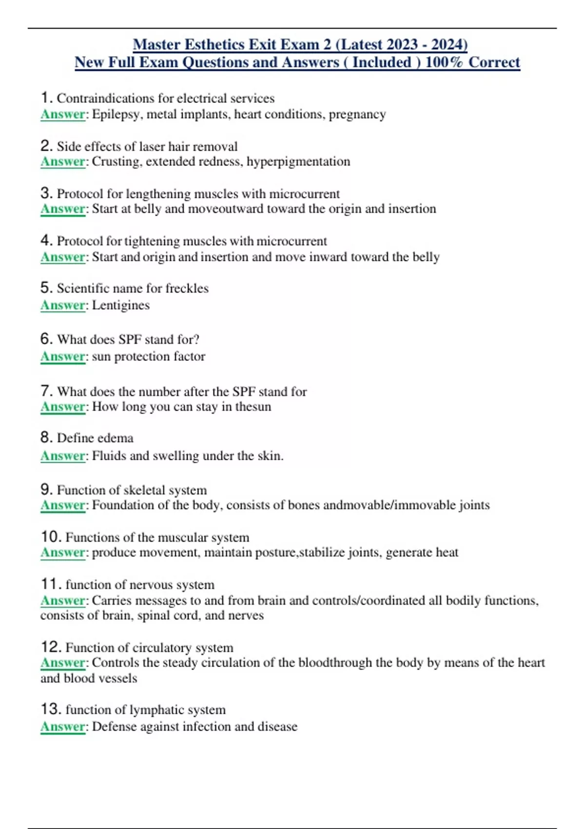 Master Esthetics Exit Exam 2 (Latest ) New Full Exam Questions and Answers ( Included ) 100% Correct 1. Contraindications for electrical services Answer: Epilepsy, metal implants, heart conditions, pregnancy 2. Side effects of laser hair removal Answer: Crusting, extended redness, hyperpigmentation 3. Protocol for lengthening muscles with microcurrent Answer: Start at belly and moveoutward toward the origin and insertion 4. Protocol for tightening muscles with microcurrent Answer: Start and origin and insertion and move inward toward the belly 5. Scientific name for freckles Answer: Lentigines 6. What does SPF stand for? Answer:sun protection factor 7. What does the number after the SPF stand for Answer: How long you can stay in thesun 8. Define edema Answer: Fluids and swelling under the skin. 9. Function of skeletal system Answer: Foundation of the body, consists of bones andmovable/immovable joints 10. Functions of the muscular system Answer: produce movement, maintain posture,stabilize joints, generate heat 11. function of nervous system Answer: Carries messages to and from brain and controls/coordinated all bodily functions, consists of brain, spinal cord, and nerves 12. Function of circulatory system Answer: Controls the steady circulation of the bloodthrough the body by means of the heart and blood vessels 13. function of lymphatic system Answer: Defense against infection and disease