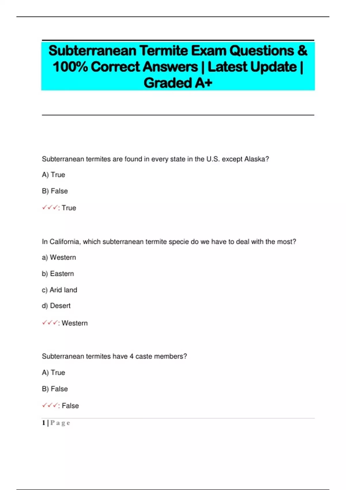Subterranean termites are found in every state in the U.S. except Alaska? A) True B) False : True In California, which subterranean termite specie do we have to deal with the most? a) Western b) Eastern c) Arid land d) Desert : Western Subterranean termites have 4 caste members? A) True B) False : False 2 | P a g e Which of these reproductive adult forms has wings? a) Primary b) Secondary c) Alternative d) Tertiary : Primary Which of these is true of subterranean termites? a) Bodies are almost black, 1/4 inch long b) Have 4 wings which are all the same length c) Their wings are almost twice as long as their body d) All the above : All the above Secondary and tertiary reproductives may migrate away, along with other members, and start up another colony without ever coming above ground? A) True B) False : True Supplementary reproductiv