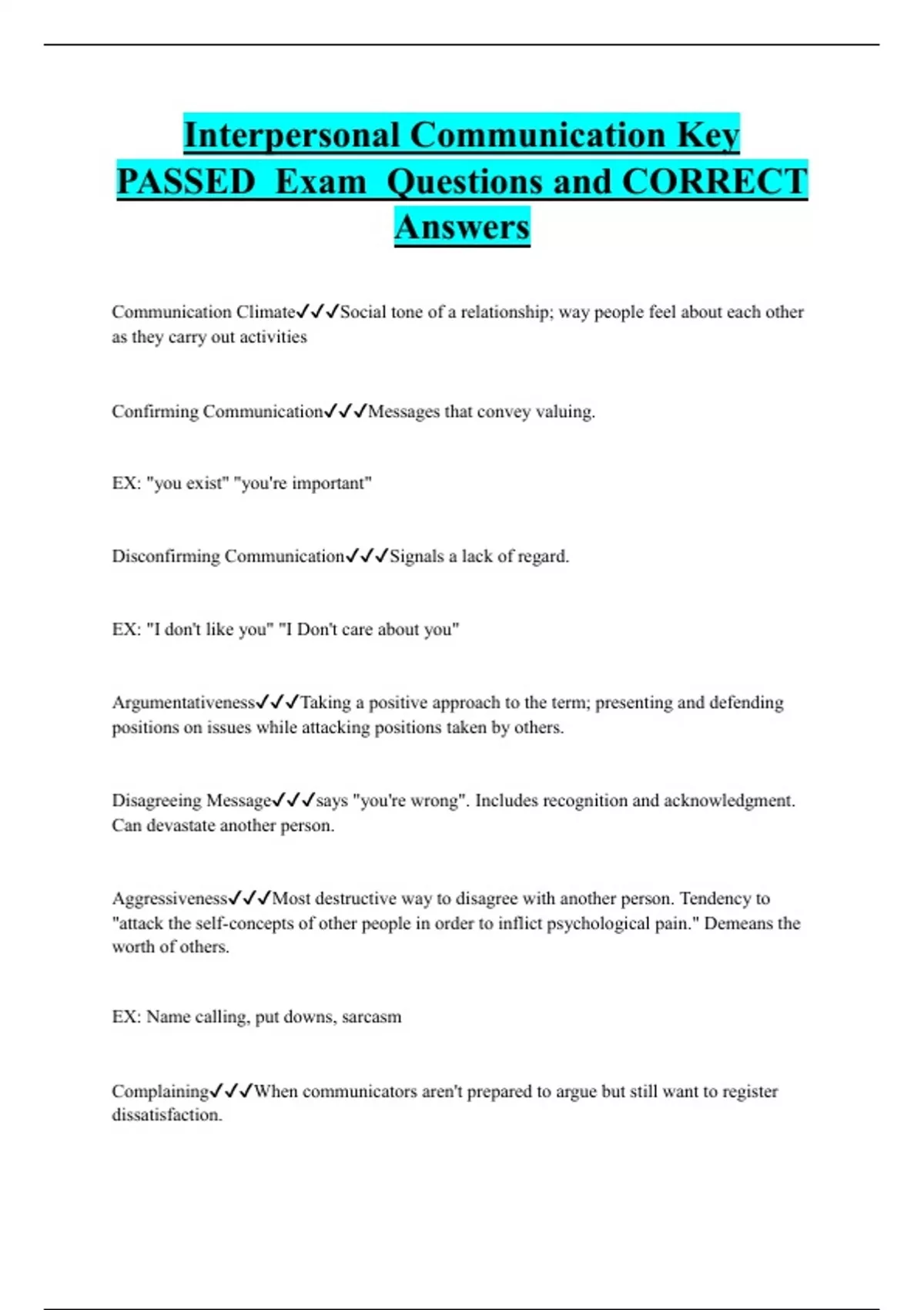 Interpersonal Communication Key PASSED Exam Questions and CORRECT Answers