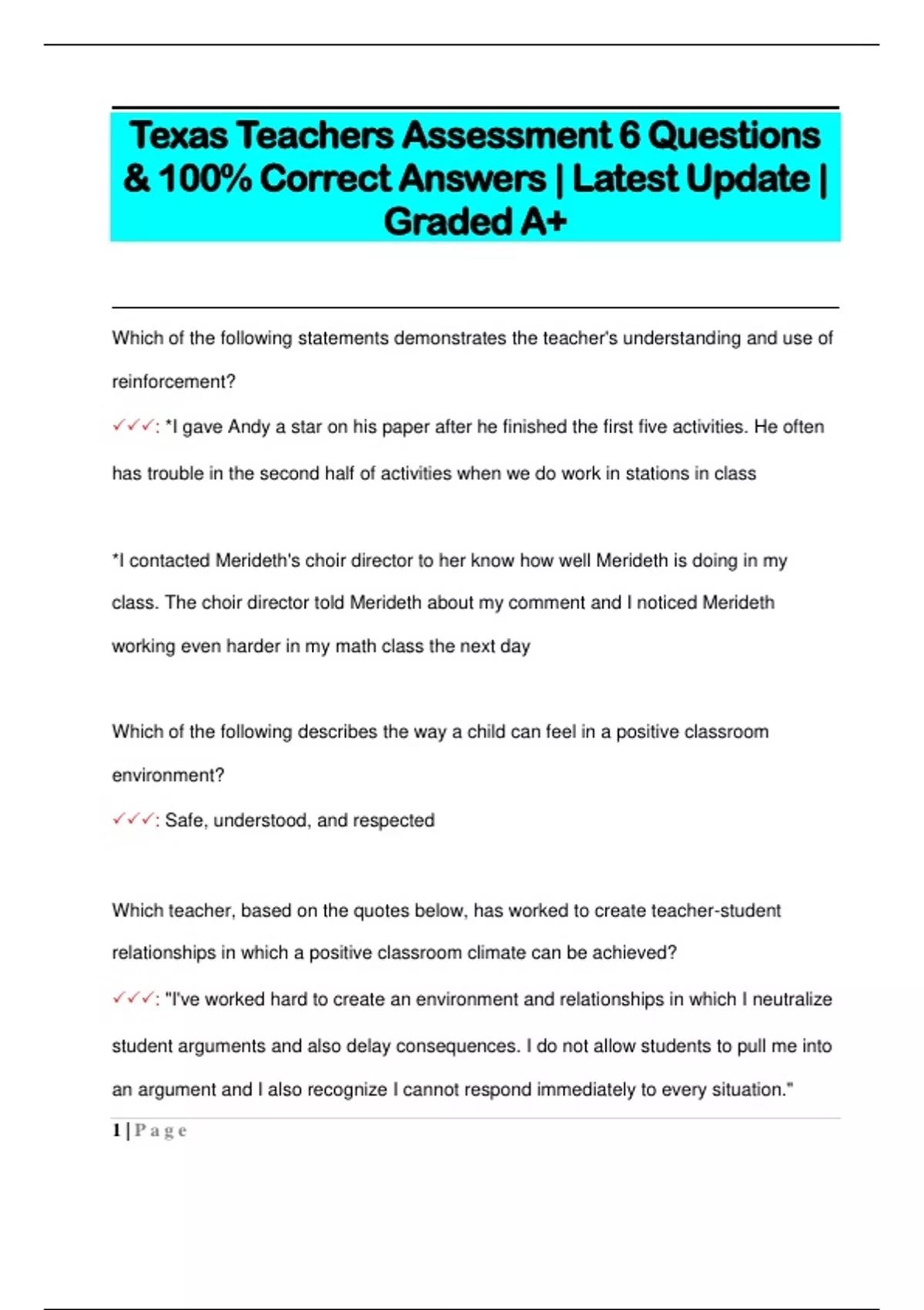 Texas Teachers Assessment 6 Questions & 100% Correct Answers | Latest Update | Graded A+