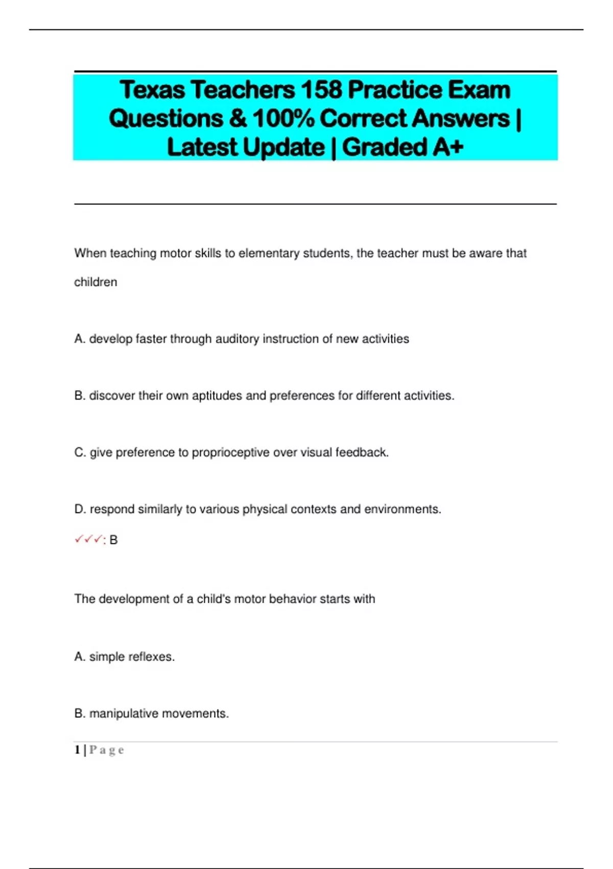 Texas Teachers 158 Practice Exam Questions & 100% Correct Answers | Latest Update | Graded A+