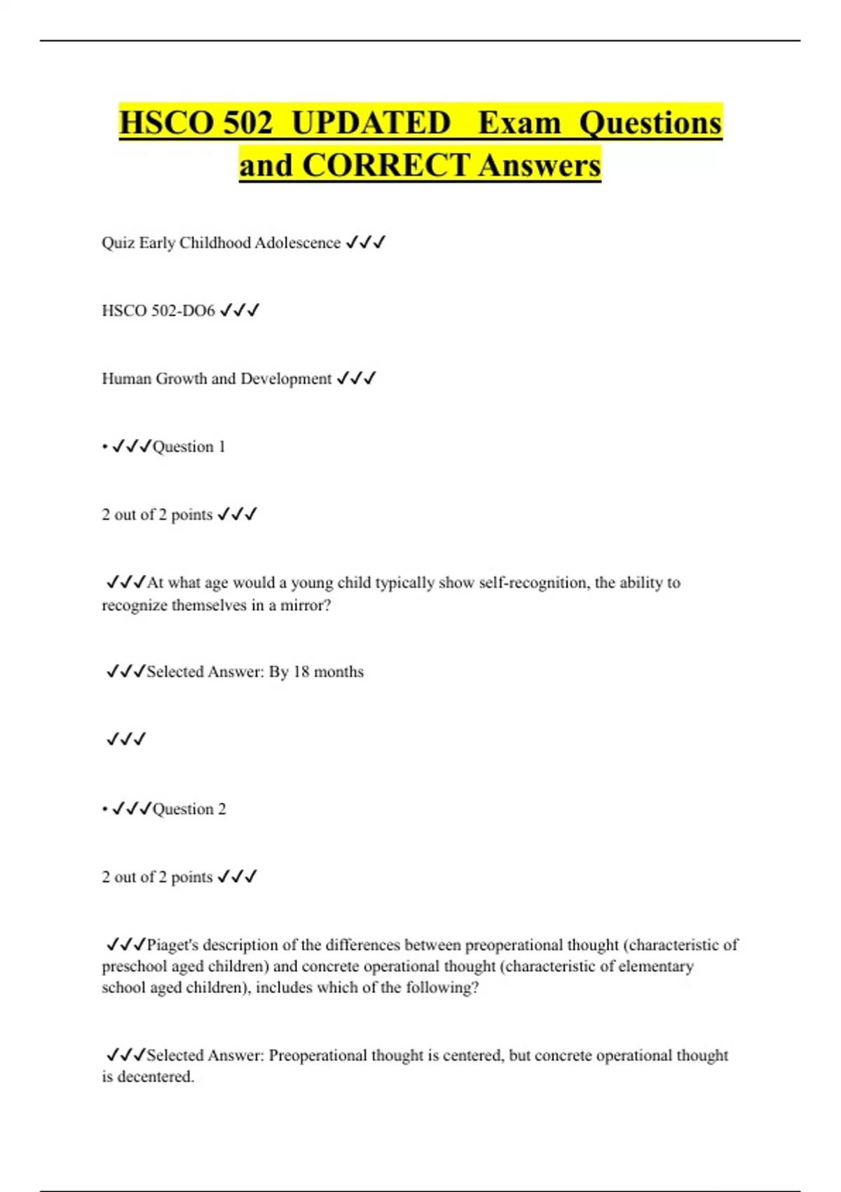 Quiz Early Childhood Adolescence HSCO 502-DO6 Human Growth and Development • Question 1 2 out of 2 points At what age would a young child typically show self-recognition, the ability to recognize themselves in a mirror? Selected Answer: By 18 months
