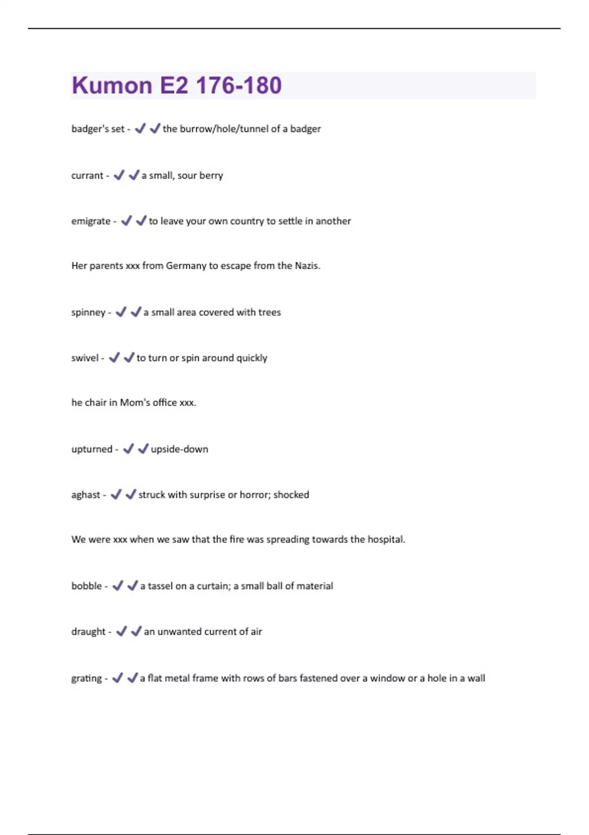 badger's set - the burrow/hole/tunnel of a badger currant - a small, sour berry emigrate - to leave your own country to settle in another Her parents xxx from Germany to escape from the Nazis. spinney - a small area covered with trees swivel - to turn or spin around quickly he chair in Mom's office xxx. upturned - upside-down aghast - struck with surprise or horror; shocked We were xxx when we saw that the fire was spreading towards the hospital. bobble - a tassel on a curtain; a small ball of material draught - an unwanted current of air grating - a flat metal frame with rows of bars fastened over a window or a hole in a wallstifle - muffle; make (someone) unable to breathe properly take on - to get upset amongst - in a group with We do not fight xxx ourselves like your kind does. dictator - a leader who has complete power He is like a xxx because his rules are strict and his punishments are harsh. poetic - being beautiful or sensitive The story is written in richly xxx language. regal - fit for a king or queen The xxx lady is her mother. siege - a long attack The xxx lasted two years. intoxicated - greatly excited He was xxx with ghold - a strong place that is easy to defend Our troops are driving toward the enemy xxx. insufficiency - lacking in ability; lack puncture - to make a hole in something shinnying - to move up or down something verge - the point where something begins or breaks They set up camp on the xxx of the desert. tyrant - a cruel or unfair ruler The people designated the King as a xxx. tangent - diverging from an original course The conversation went off at a xxx. amble - to walk slowly or leisurely We xxx through the fields fringe - a marginal, peripheral, edge or secondary part; less important