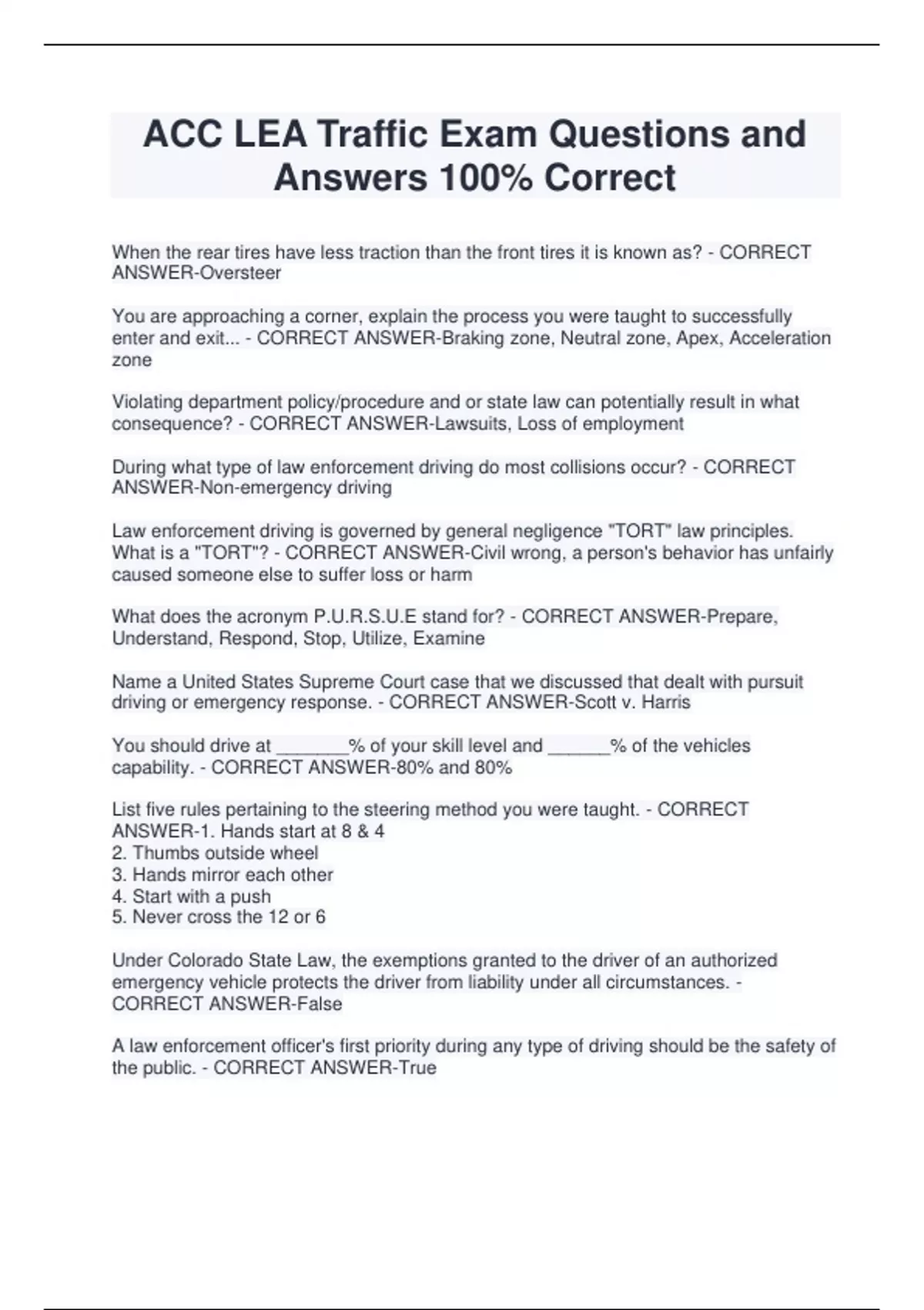 ACC LEA Traffic Exam Questions and Answers 100% Correct When the rear tires have less traction than the front tires it is known as? - CORRECT ANSWER-Oversteer You are approaching a corner, explain the process you were taught to successfully enter and exit... - CORRECT ANSWER-Braking zone, Neutral zone, Apex, Acceleration zone Violating department policy/procedure and or state law can potentially result in what consequence? - CORRECT ANSWER-Lawsuits, Loss of employment During what type of law enforcement driving do most collisions occur? - CORRECT ANSWER-Non-emergency driving Law enforcement driving is governed by general negligence "TORT" law principles. What is a "TORT"? - CORRECT ANSWER-Civil wrong, a person's behavior has unfairly caused someone else to suffer loss or harm What does the acronym P.U.R.S.U.E stand for? - CORRECT ANSWER-Prepare, Understand, Respond, Stop, Utilize, Examine Name a United States Supreme Court case that we discussed that dealt with pursuit driving or emergency response. - CORRECT ANSWER-Scott v. Harris You should drive at _______% of your skill level and ______% of the vehicles capability. - CORRECT ANSWER-80% and 80% List five rules pertaining to the steering method you were taught. - CORRECT ANSWER-1. Hands start at 8 & 4 2. Thumbs outside wheel 3. Hands mirror each other 4. Start with a push 5. Never cross the 12 or 6