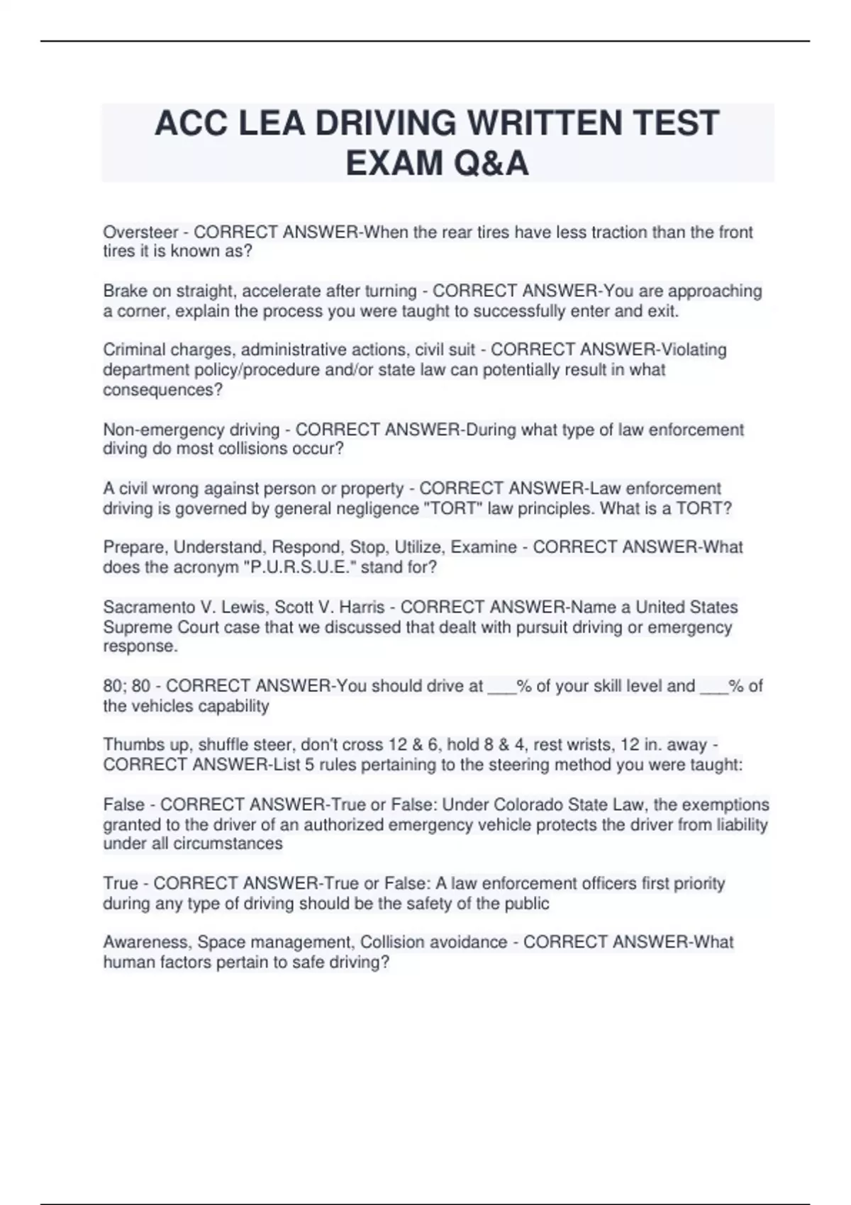 ACC LEA DRIVING WRITTEN TEST EXAM Q&A Oversteer - CORRECT ANSWER-When the rear tires have less traction than the front tires it is known as? Brake on straight, accelerate after turning - CORRECT ANSWER-You are approaching a corner, explain the process you were taught to successfully enter and exit. Criminal charges, administrative actions, civil suit - CORRECT ANSWER-Violating department policy/procedure and/or state law can potentially result in what consequences? Non-emergency driving - CORRECT ANSWER-During what type of law enforcement diving do most collisions occur?