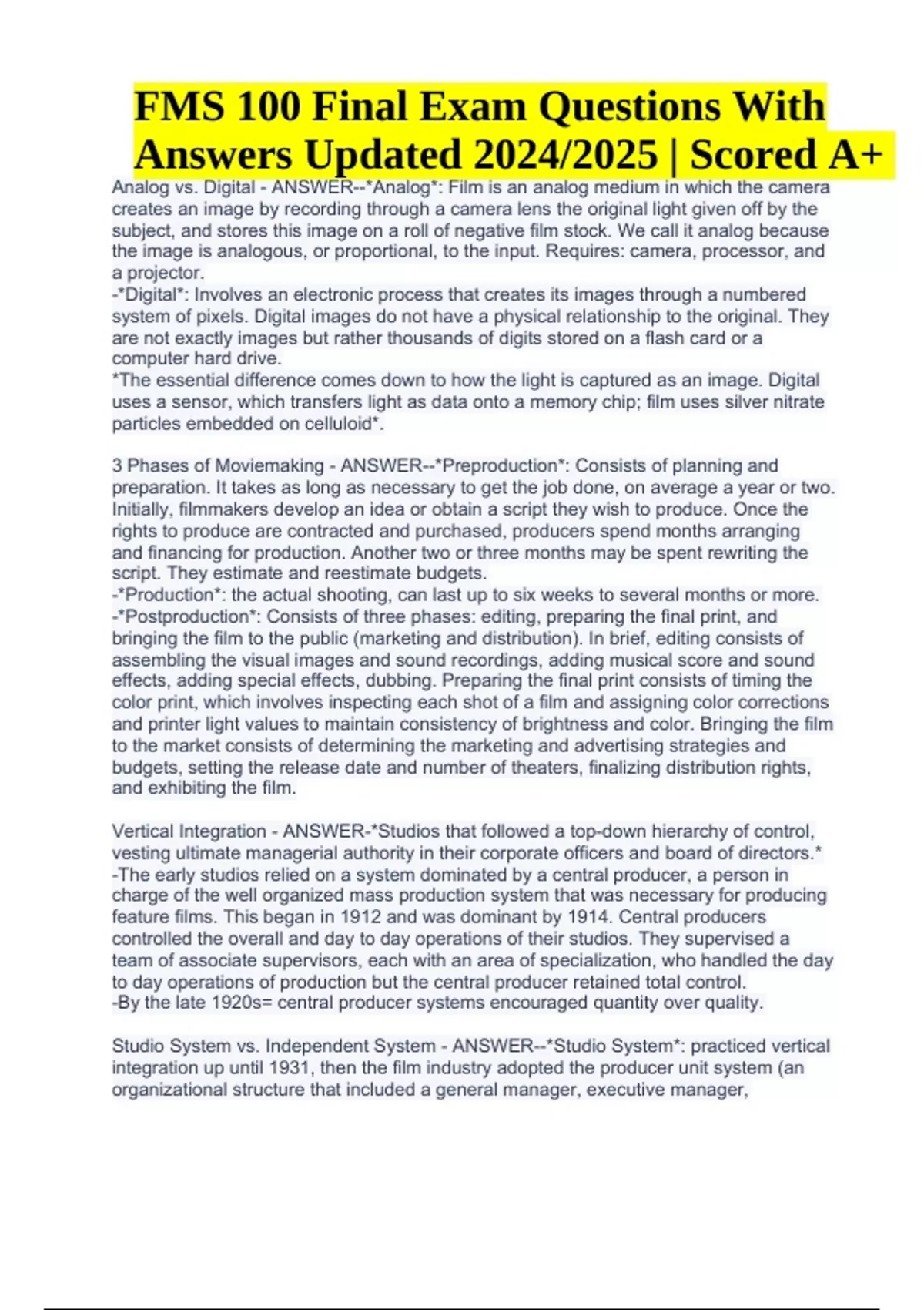 FMS 100 Final Exam Questions With Answers Updated 2024/2025 | Rated A+. 3 Phases of Moviemaking - ANSWER--*Preproduction*: Consists of planning and preparation. It takes as long as necessary to get the job done, on average a year or two. Initially, filmmakers develop an idea or obtain a script they wish to produce. Once the rights to produce are contracted and purchased, producers spend months arranging and financing for production. Another two or three months may be spent rewriting the script. They estimate and reestimate budgets. -*Production*: the actual shooting, can last up to six weeks to several months or more. -*Postproduction*: Consists of three phases: editing, preparing the final print, and bringing the film to the public (marketing and distribution). In brief, editing consists of assembling the visual images and sound recordings, adding musical score and sound effects, adding special effects, dubbing. Preparing the final print consists of timing the color print, which involves inspecting each shot of a film and assigning color corrections and printer light values to maintain consistency of brightness and color. Bringing the film to the market consists of determining the marketing and advertising strategies and budgets, setting the release date and number of theaters, finalizing distribution rights, and exhibiting the film. Vertical Integration - ANSWER-*Studios that followed a top-down hierarchy of control, vesting ultimate managerial authority in their corporate officers and board of directors.* -The early studios relied on a system dominated by a central producer, a person in charge of the well organized mass production system that was necessary for producing feature films. This began in 1912 and was dominant by 1914. Central producers controlled the overall and day to day operations of their studios. They supervised a team of associate supervisors, each with an area of specialization, who handled the day to day operations of production but the central producer retained total control. -By the late 1920s= central producer systems encouraged quantity over quality. Studio System vs. Independent System - ANSWER--*Studio System*: practiced vertical integration up until 1931, then the film industry adopted the producer unit system (an organizational structure that included a general manager, executive manager, FMS 100 Final Exam Questions With Answers Updated 2024/2025 | Scored A+ production manager, studio manager, and individual production supervisors. Each studio had its own configuration. This system valued profitability above all else. The studio system established an industrial model of production through which american filmmaking became one of the most prolific and lucrative enterprises in the world. By the mid 1930s, Hollywood was divided into four kinds of film production companies: majors, minors, "B" studios, and independent producers. -*Independent System*: Sometimes called the package unit system coexisted within the studio system through the 1930s and 40s. The package unit system, controlled by a producer unaffiliated with a studio is a personalized concept of film production that differs significantly from the industrial model of the studio system. It governs the creation, distribution, and exhibition of a movie. An independent producer makes one film at a time, relying on rented facilities and equipment and a creative staff assembled for that one film. Decline of the Studio System - ANSWER-By the mid 1930s, the system had reacher a turning point due to numerous factors: -The studios were victims of their own success -Several actions taken by the federal government signaled that the studio's old ways of doing business would have to change (labor unions, 1933 National Industrial Recovery Act). -The studios began to reorganize their management into the producer unit system. -A shift in relations between top management and creative personnel that loosened the studio's hold on the system. -WWII: severely restricted the studios' regular, for profit operations. -The rise of television. Financing, Marketing, Distribution - ANSWER--*Financing*: no rules govern the arranging of financing. Money can come from the studio, the producer, the investment community, or a combination of these. In the old studio system, the general manager determined the budget. Today, usually the producer or a member of the producer's team prepares the budget with the assistant director. -*Marketing*: Preview screenings, focus groups, final changes to the film, media coverage, festival screenings and awards, and audience word of mouth. Determination of the release date, number of theaters, etc. -*Distribution*: exclusive and limited releases, key-city releases, and wide and saturated releases. Hollywood is planning to bring movies to homes at the same time, or close to it, that they are released in theaters. Blaxpoitation - ANSWER-the exploitation of black people, especially with regard to stereotyped roles in movies. Sweet Sweetback's Baadasssss Song - ANSWER-No studio would finance the film, so Van Peebles funded the film himself, shooting it independently over a period of 19 days, performing all of his own stunts and appearing in several unsimulated sex scenes. He received a $50,000 loan from Bill Cosby to complete the project. The film's fast-paced montages and jump-cuts were unique features in American cinema at the time. The picture was censored in some markets, and received mixed critical reviews. However, it has left a lasting impression on African-American cinema. Narrative/Narration/Narrator - ANSWER--*Narrative*: The story and how it is told. -*Narration*: the act of telling the story. -*Narrator*: Who/what tells the story. Narrative entails narration and implies a narrator. No such thing as third-person narration—there is always a subject, even if it never says "I". No objective point of view. If the narrator never refers to her-/himself as a character, then s/he may be considered an 