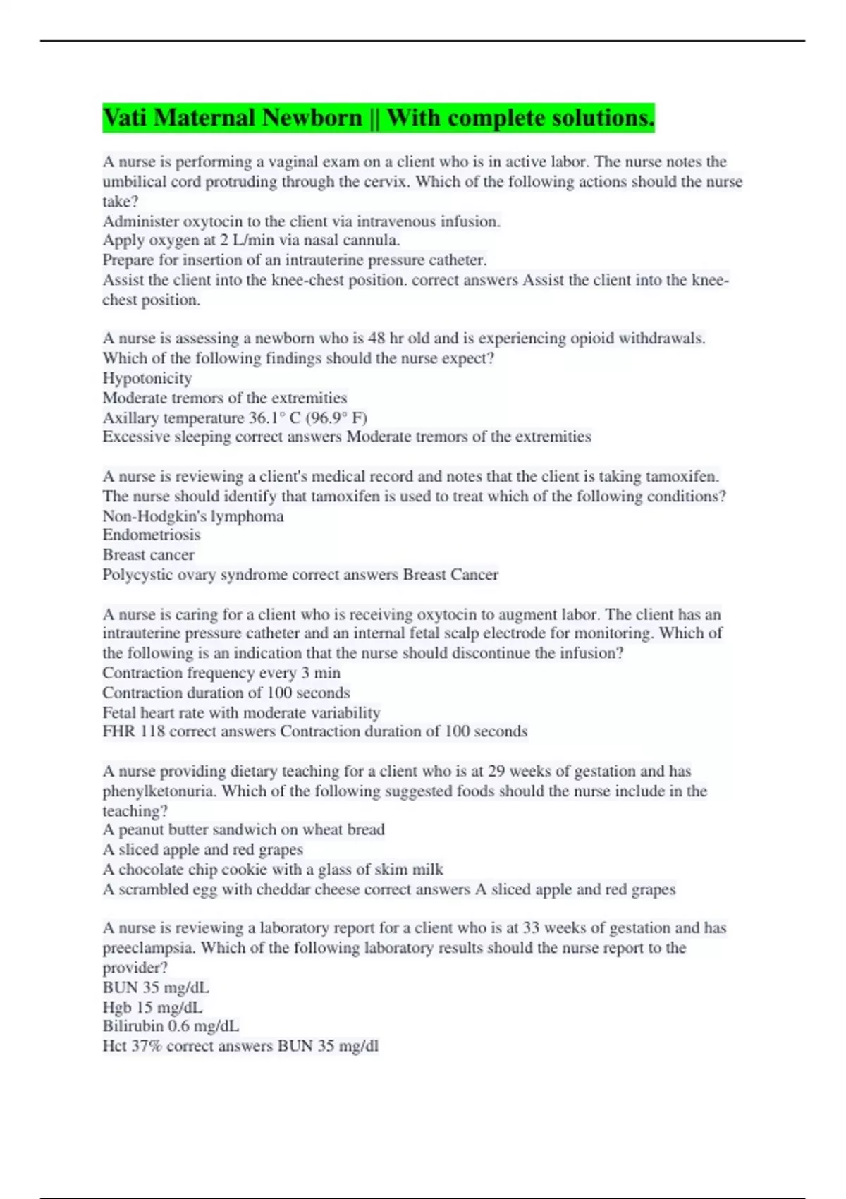 A nurse is performing a vaginal exam on a client who is in active labor. The nurse notes the umbilical cord protruding through the cervix. Which of the following actions should the nurse take? Administer oxytocin to the client via intravenous infusion. Apply oxygen at 2 L/min via nasal cannula. Prepare for insertion of an intrauterine pressure catheter. Assist the client into the knee-chest position. correct answers Assist the client into the knee-chest position. A nurse is assessing a newborn who is 48 hr old and is experiencing opioid withdrawals. Which of the following findings should the nurse expect? Hypotonicity Moderate tremors of the extremities Axillary temperature 36.1° C (96.9° F) Excessive sleeping correct answers Moderate tremors of the extremities A nurse is reviewing a client's medical record and notes that the client is taking tamoxifen. The nurse should identify that tamoxifen is used to treat which of the following conditions? Non-Hodgkin's lymphoma Endometriosis Breast cancer Polycystic ovary syndrome correct answers Breast Cancer A nurse is caring for a client who is receiving oxytocin to augment labor. The client has an intrauterine pressure catheter and an internal fetal scalp electrode for monitoring. Which of the following is an indication that the nurse should discontinue the infusion? Contraction frequency every 3 min Contraction duration of 100 seconds Fetal heart rate with moderate variability FHR 118 correct answers Contraction duration of 100 seconds A nurse providing dietary teaching for a client who is at 29 weeks of gestation and has phenylketonuria. Which of the following suggested foods should the nurse include in the teaching? A peanut butter sandwich on wheat bread A sliced apple and red grapes A chocolate chip cookie with a glass of skim milk A scrambled egg with cheddar cheese correct answers A sliced apple and red grapes A nurse is reviewing a laboratory report for a client who is at 33 weeks of gestation and has preeclampsia. Which of the following laboratory results should the nurse report to the provider? BUN 35 mg/dL Hgb 15 mg/dL Bilirubin 0.6 mg/dL Hct 37% correct answers BUN 35 mg/dl