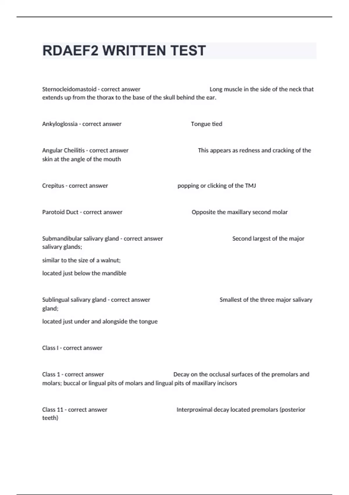Sternocleidomastoid - correct answer Long muscle in the side of the neck that extends up from the thorax to the base of the skull behind the ear. Ankyloglossia - correct answer Tongue tied Angular Cheilitis - correct answer This appears as redness and cracking of the skin at the angle of the mouth Crepitus - correct answer popping or clicking of the TMJ Parotoid Duct - correct answer Opposite the maxillary second molar Submandibular salivary gland - correct answer Second largest of the major salivary glands; similar to the size of a walnut; located just below the mandible Sublingual salivary gland - correct answer Smallest of the three major salivary gland; located just under and alongside the tongue Class I - correct answer Class 1 - correct answer Decay on the occlusal surfaces of the premolars and molars; buccal or lingual pits of molars and lingual pits of maxillary incisors Class 11 - correct answer Interproximal decay located premolars (posterior teeth) Class 111 - correct answer Interproximal decay located on incisors and cuspids (anterior teeth) Class IV - correct answer Anterior interproximal decay involving the incisal edge Class V - correct answer buccal Decay that occurs at the gingival third, or lingual surface of any tooth Class VI - correct answer lingual Decay on the incisal edges of anterior teeth and/or the cusp tips of posterior teeth caused by wear Regular border - correct answer resembles a symmetrical circle or an oval shape. Irregular border. - correct answer not uniform or has deviations from circular or oval shape. Smooth margin. - correct answer level with the surface of the lesion. Raised margin - correct answer above the level of the surface of the lesion. Papule. - correct answer a solid raised lesion that is usually less than 1 cm in diameter. A papule may be any color Example: an elevated mole Plaque. A - correct answer a superficial raised lesion often formed by the coalescence (joining) of closely grouped papules. is more than 1 cm in diameter; a plaque dif- fers from a nodule in its height; a plaque is flattened, and a nodule is a bump. -Examples: leukoplakia, psoriasis Nodule. - correct answer raised marble-like le- sion detectable by touch, usually 1 cm or more in diameter. It can be felt as a hard mass distinct from the tissue surrounding it. -Examples: wart, basal cell carcinoma, melanoma, en- larged lymph node Vesicle. - correct answer a small blister filled with fluid usually is 1 cm or less in diameter. -Examples: herpes simplex, herpes zoster, chickenpox, and smallpox lesions Pustule. - correct answer a small raised le- sion filled with pus. Examples: acne, boil, abscess Ulcer. - correct answer a craterlike lesion of the skin or mucosa where the top two layers of the skin are lost. . The depth is superficial if it is less than 3 mm. -Examples: aphthous ulcer, chickenpox lesions Primary Bonds - correct answer Strong bonds with electronic attractions; ionic bonds, metallic bonds Secondary Bonds - correct answer Weaker than primary bonds; hydrogen bonds Brittleness - correct answer The hardness; likelihood of breaking or cracking of a material Density - correct answer The measure of the weight of a material compared with its volume Hardness - correct answer The The resistance of a solid to penetration Elasticity - correct a