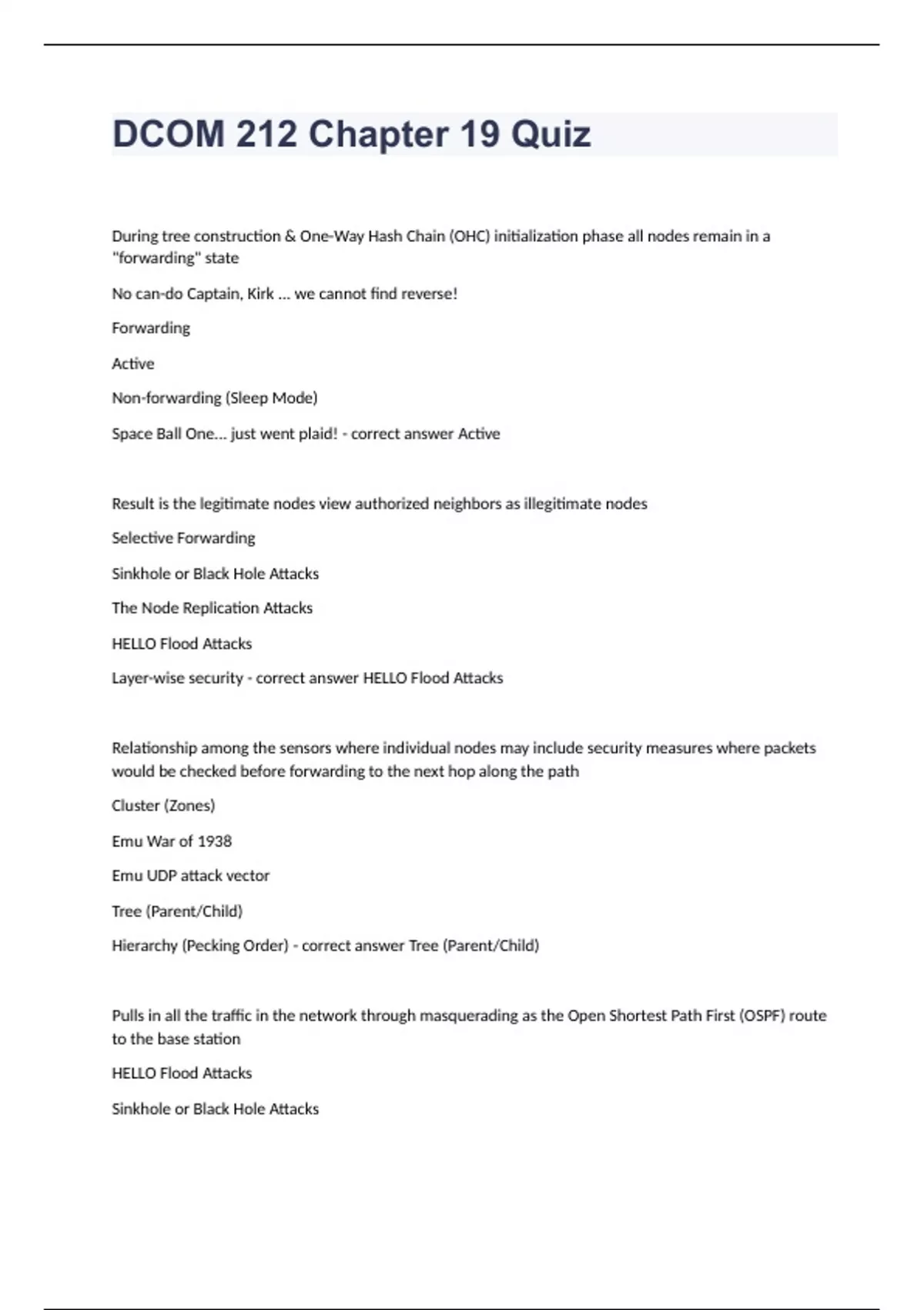 DCOM 212 Chapter 19 Quiz With Correct Answers 2024. During tree construction & One-Way Hash Chain (OHC) initialization phase all nodes remain in a "forwarding" state No can-do Captain, Kirk ... we cannot find reverse! Forwarding Active Non-forwarding (Sleep Mode) Space Ball One... just went plaid! - correct answer Active Result is the legitimate nodes view authorized neighbors as illegitimate nodes Selective Forwarding Sinkhole or Black Hole Attacks The Node Replication Attacks HELLO Flood Attacks Layer-wise security - correct answer HELLO Flood Attacks Relationship among the sensors where individual nodes may include security measures where packets would be checked before forwarding to the next hop along the path Cluster (Zones) Emu War of 1938 Emu UDP attack vector Tree (Parent/Child) Hierarchy (Pecking Order) - correct answer Tree (Parent/Child)