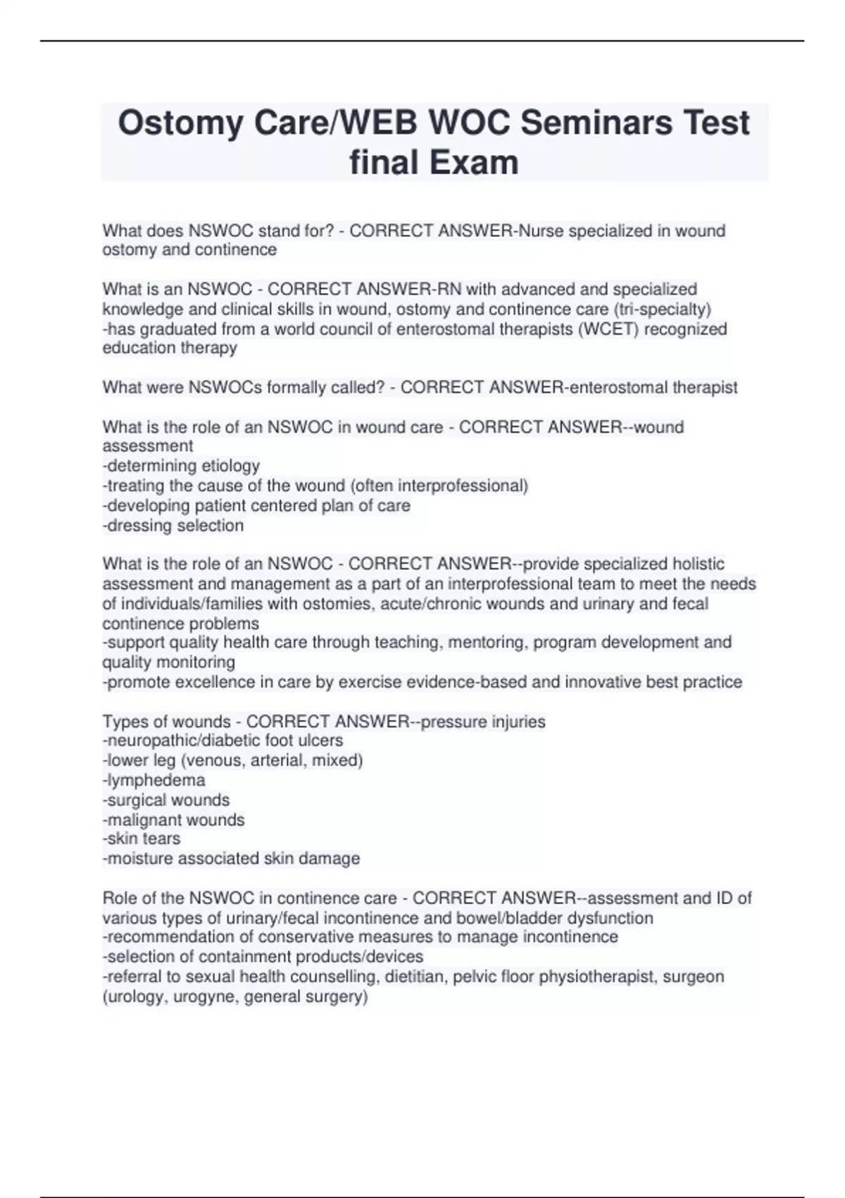 Ostomy Care/WEB WOC Seminars Test final Exam What does NSWOC stand for? - CORRECT ANSWER-Nurse specialized in wound ostomy and continence What is an NSWOC - CORRECT ANSWER-RN with advanced and specialized knowledge and clinical skills in wound, ostomy and continence care (tri-specialty) -has graduated from a world council of enterostomal therapists (WCET) recognized education therapy What were NSWOCs formally called? - CORRECT ANSWER-enterostomal therapist What is the role of an NSWOC in wound care - CORRECT ANSWER--wound assessment -determining etiology -treating the cause of the wound (often interprofessional) -developing patient centered plan of care -dressing selection What is the role of an NSWOC - CORRECT ANSWER--provide specialized holistic assessment and management as a part of an interprofessional team to meet the needs of individuals/families with ostomies, acute/chronic wounds and urinary and fecal continence problems -support quality health care through teaching, mentoring, program development and quality monitoring -promote excellence in care by exercise evidence-based and innovative best practice Types of wounds - CORRECT ANSWER--pressure injuries -neuropathic/diabetic foot ulcers -lower leg (venous, arterial, mixed) -lymphedema -surgical wounds -malignant wounds -skin tears -moisture associated skin damage Role of the NSWOC in continence care - CORRECT ANSWER--assessment and ID of various types of urinary/fecal incontinence and bowel/bladder dysfunction -recommendation of conservative measures to manage incontinence -selection of containment products/devices -referral to sexual health counselling, dietitian, pelvic floor physiotherapist, surgeon (urology, urogyne, general surgery) Conservative measures to manage incontienence - CORRECT ANSWER--diet and fluid management -toileting schedules -bladder and bowel training programs -skin care -pelvic muscle re-education Containment products/devices for incontinence - CORRECT ANSWER--briefs