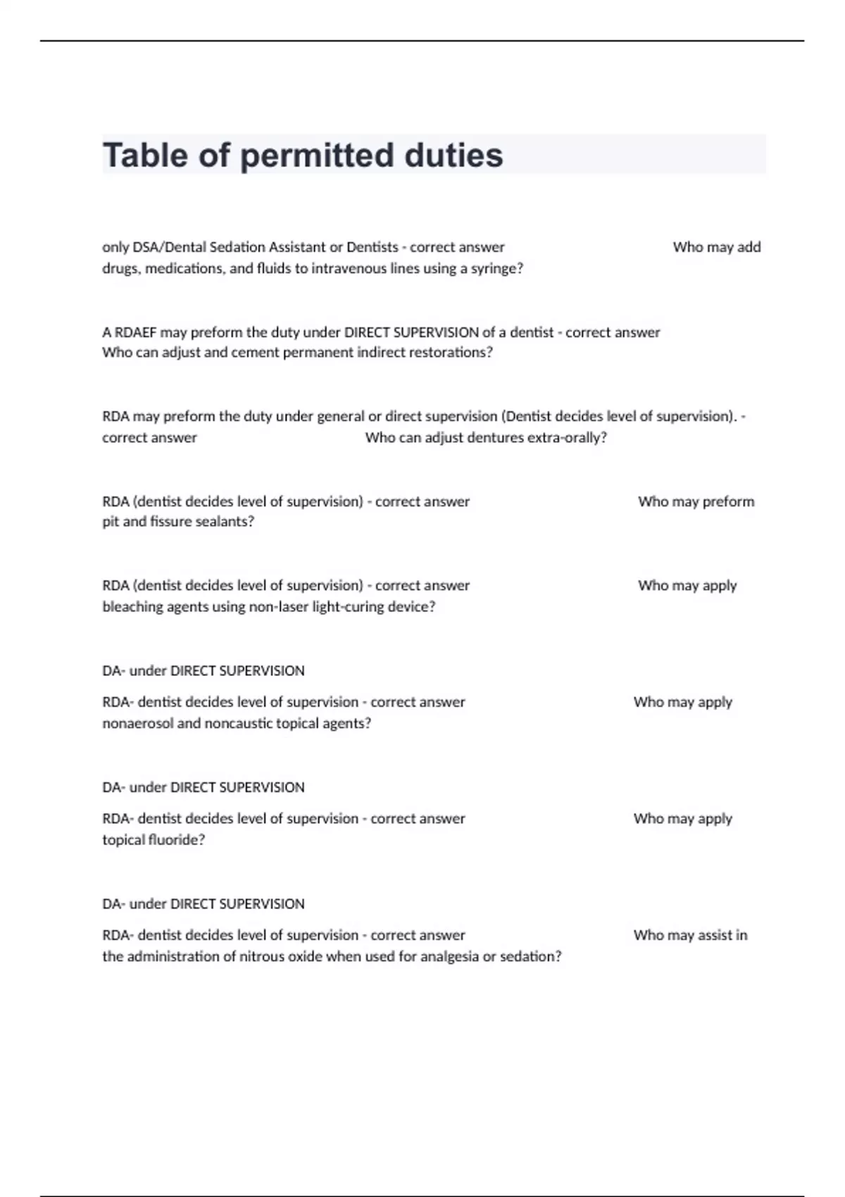 only DSA/Dental Sedation Assistant or Dentists - correct answer Who may add drugs, medications, and fluids to intravenous lines using a syringe? A RDAEF may preform the duty under DIRECT SUPERVISION of a dentist - correct answer Who can adjust and cement permanent indirect restorations? RDA may preform the duty under general or direct supervision (Dentist decides level of supervision). - correct answer Who can adjust dentures extra-orally? RDA (dentist decides level of supervision) - correct answer Who may preform pit and fissure sealants? RDA (dentist decides level of supervision) - correct answer Who may apply bleaching agents using non-laser light-curing device? DA- under DIRECT SUPERVISION RDA- dentist decides level of supervision - correct answer Who may apply nonaerosol and noncaustic topical agents? DA- under DIRECT SUPERVISION RDA- dentist decides level of supervision - correct answer Who may apply topical fluoride? DA- under DIRECT SUPERVISION RDA- dentist decides level of supervision - correct answer Who may assist in the administration of nitrous oxide when used for analgesia or sedation? DA- under DIRECT SUPERVISION RDA- dentist decides level of supervision - correct answer After adjustment by the dentist, who may seat removable orthodontic appliances and deliver care instructions to the patients? RDEAF- under DIRECT SUPERVISION - correct answer Who may cement endodontic master points and accessory points? RDA- dentist decides level of supervision - correct answer Who may chemically prepare teeth for bonding? RDEAF- under DIRECT SUPERVISION - correct answer Who may conduct preliminary evaluation of the patients oral health including, but not limited to: charting, intraoral and extra-oral evaluation of soft tissue, classifying occlusion and myofunctional evaluation? RDEAF- under DIRECT SUPERVISION - correct answer Who may do cord retraction of gingiva for impression procedures? DA- under DIRECT SUPERVISION RDA- dentist decides level of supervision - correct answer Who may cure restorative or orthodontic materials in operative site with a light curing device? RDA- dentist decides level of supervision - correct answer Who may dry endodontically treated canals using absorbent paper points? DA- under DIRECT SUPERVISION RDA- dentist decides level of supervision - correct answer who may examine orthodontic appliances? DA- under DIRECT SUPERVISION RDA- dentist decides level of supervision - correct answer Who can preform extra-oral duties or procedures specified by the supervising licensed dentist? RDA- dentist decides level of supervision - correct answer Who can fabricate, adjust, cement and removed indirect provisional restorations, including stainless steal crowns when used as a provisional restoration? RDAEF- under DIRECT SUPERVISION - correct answer Who can fit trial endodontic filling points? RDAEF- under DIRECT SUPERVISION - correct answer Who can formulate indirect patterns for endodontic post and core castings? DA- under DIRECT SUPERVISION RDA- dentist decides level of supervision - correct answer Who may monitor patient sedation, limited to reading and transmitting the information from the monitor display during the inoperative phase of surgery? DSA- under DIRECT SUPERVISION - correct answer Who may monitor patients undergoing conscious sedation or general anesthesia utilizing data from noninvasive instrumentation? RDA- dentist decides level of supervision - correct answer Who may do a mouth mirror inspection of the oral cavity, to include charting of obvious lesions, existing restorations and missing teeth. RDA- dentist decides level of supervision - correct answer Who can obtain intraoral images for computer aided design (CAD), milled restorations? DA- GENERAL SUPERVISION RDA- GENERAL SUPERVISION RDAEF- GENERAL SUPERVISION - correct answer Who can operate dental radiography equipment for the purpose of oral radiography? DA- GENERAL SUPERVISION RDA- GENERAL SUPERVISION RDAEF- GENER