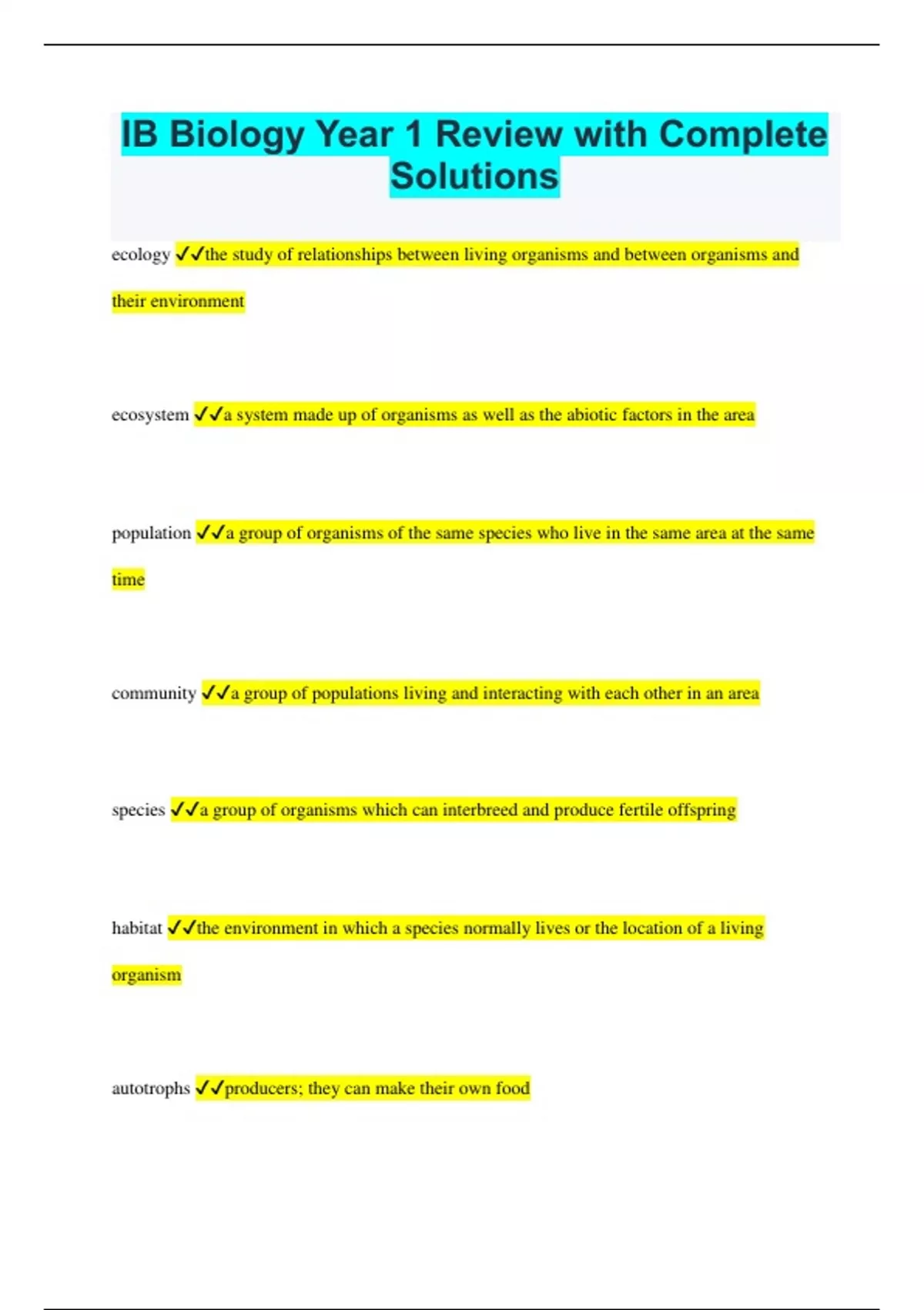 IB Biology Year 1 Review with Complete Solutions ecology the study of relationships between living organisms and between organisms and their environment ecosystem a system made up of organisms as well as the abiotic factors in the area population a group of organisms of the same species who live in the same area at the same time community a group of populations living and interacting with each other in an area species a group of organisms which can interbreed and produce fertile offspring habitat the environment in which a species normally lives or the location of a living organism autotrophs producers; they can make their own food heterotrophs consumers; they feed on ready made organic material detritivores organisms that feed on the detritus and decomposing organic material of living organisms saprotrophs decomposers; organisms that feed on dead organisms and products of living organisms carrying capacity the maximum number of organisms of a species, or the maximum population size which an environment is able to support random sample a sample where every individual in a population has an equal chance of being chosen trophic level Position in the food chain, determined by the number of energy-transfer steps to that level; a functional classification of taxa within a community that is based on feeding relationships standard deviation used to summarize the spread of values around the mean; Σ((X-X)²/n-1) species a group of organisms with similar characteristics, which can interbreed and produce fertile offspring evolution change in a gene pool of a species over a period of time organelle a discrete structure within a cell, and has a specific function magnification measure size of diagram ÷ actual size o