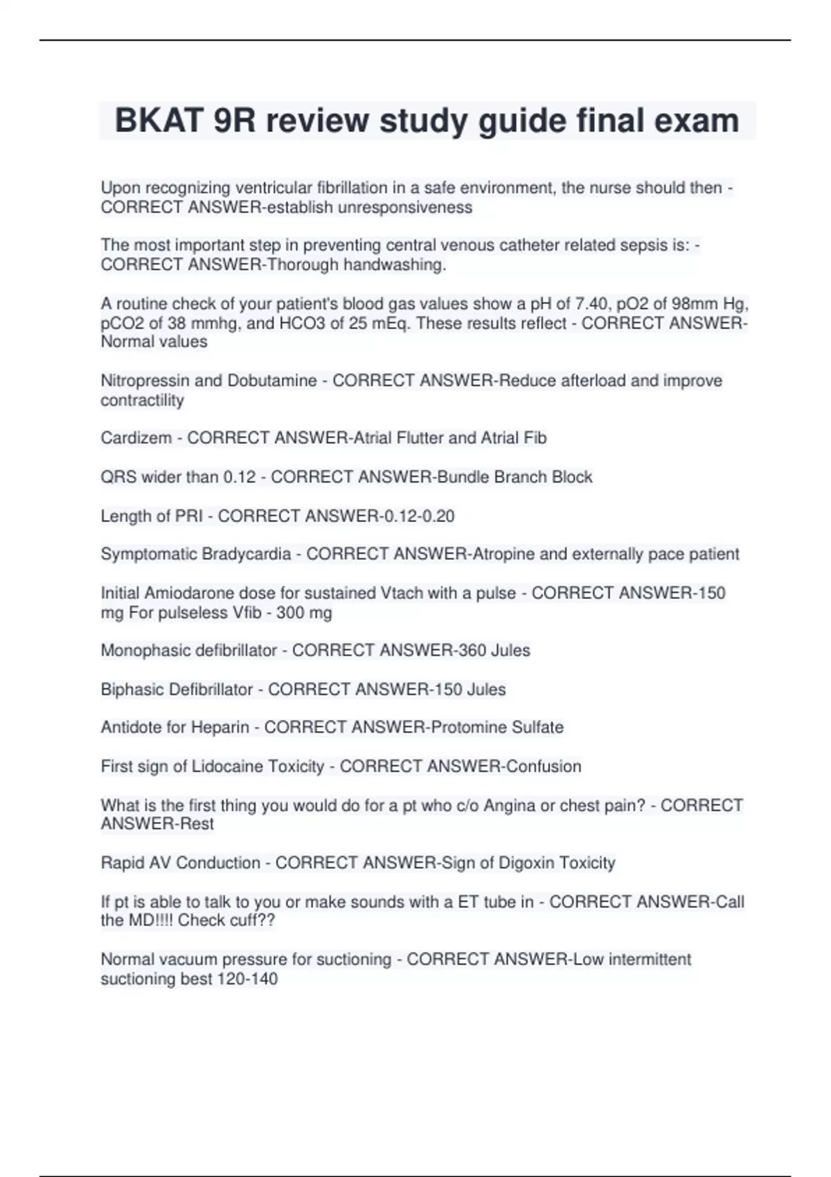 BKAT 9R review study guide final exam Upon recognizing ventricular fibrillation in a safe environment, the nurse should then - CORRECT ANSWER-establish unresponsiveness The most important step in preventing central venous catheter related sepsis is: - CORRECT ANSWER-Thorough handwashing. A routine check of your patient's blood gas values show a pH of 7.40, pO2 of 98mm Hg, pCO2 of 38 mmhg, and HCO3 of 25 mEq. These results reflect - CORRECT ANSWERNormal values Nitropressin and Dobutamine - CORRECT ANSWER-Reduce afterload and improve contractility Cardizem - CORRECT ANSWER-Atrial Flutter and Atrial Fib QRS wider than 0.12 - CORRECT ANSWER-Bundle Branch Block Length of PRI - CORRECT ANSWER-0.12-0.20 Symptomatic Bradycardia - CORRECT ANSWER-Atropine and externally pace patient Initial Amiodarone dose for sustained Vtach with a pulse - CORRECT ANSWER-150 mg For pulseless Vfib - 300 mg Monophasic defibrillator - CORRECT ANSWER-360 Jules Biphasic Defibrillator - CORRECT ANSWER-150 Jules Antidote for Heparin - CORRECT ANSWER-Protomine Sulfate