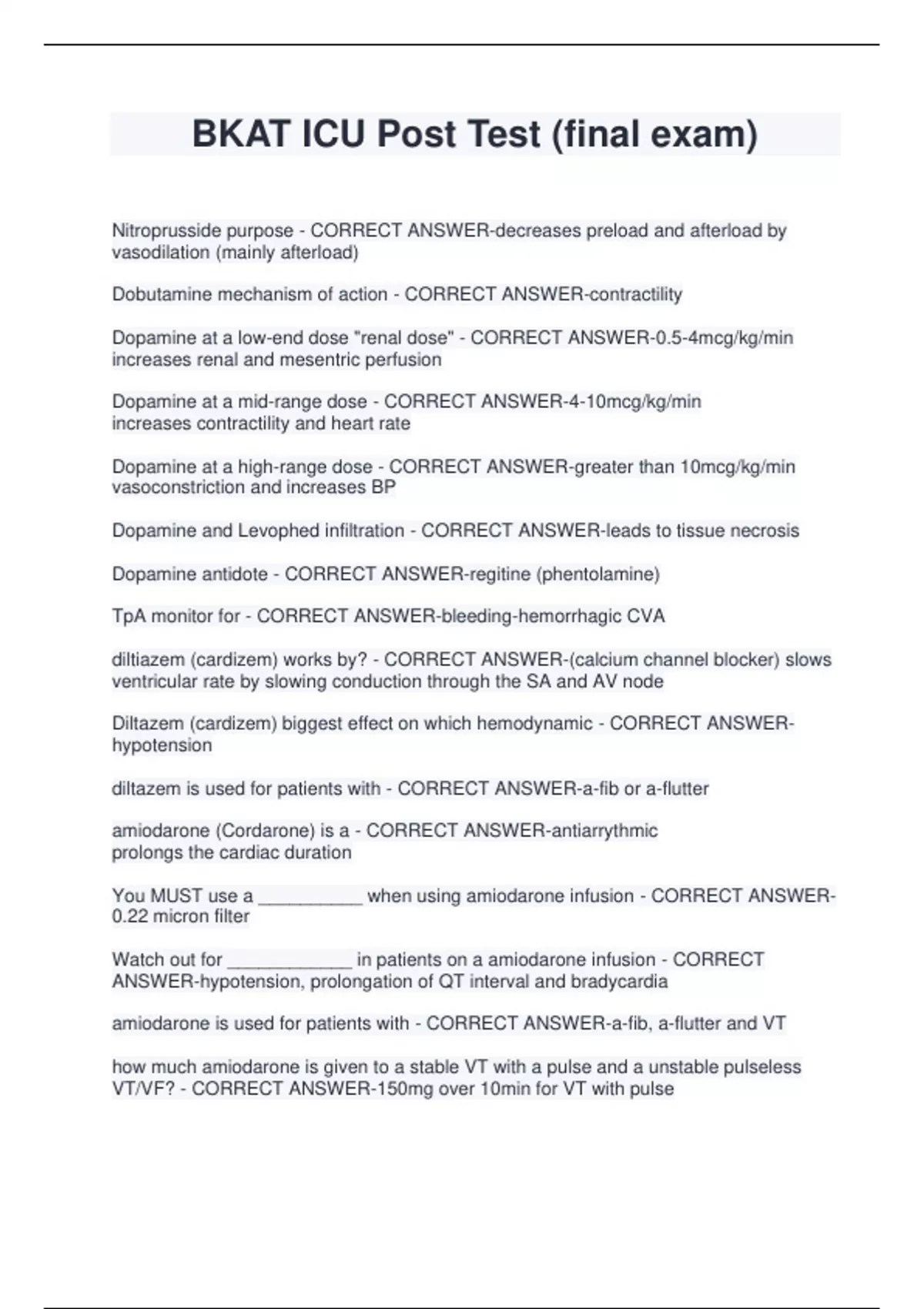 BKAT ICU Post Test (final exam) Nitroprusside purpose - CORRECT ANSWER-decreases preload and afterload by vasodilation (mainly afterload) Dobutamine mechanism of action - CORRECT ANSWER-contractility Dopamine at a low-end dose "renal dose" - CORRECT ANSWER-0.5-4mcg/kg/min increases renal and mesentric perfusion Dopamine at a mid-range dose - CORRECT ANSWER-4-10mcg/kg/min increases contractility and heart rate Dopamine at a high-range dose - CORRECT ANSWER-greater than 10mcg/kg/min vasoconstriction and increases BP Dopamine and Levophed infiltration - CORRECT ANSWER-leads to tissue necrosis Dopamine antidote - CORRECT ANSWER-regitine (phentolamine) TpA monitor for - CORRECT ANSWER-bleeding-hemorrhagic CVA diltiazem (cardizem) works by? - CORRECT ANSWER-(calcium channel blocker) slows ventricular rate by slowing conduction through the SA and AV node Diltazem (cardizem) biggest effect on which hemodynamic - CORRECT ANSWERhypotension diltazem is used for patients with - CORRECT ANSWER-a-fib or a-flutter amiodarone (Cordarone) is a - CORRECT ANSWER-antiarrythmic prolongs the cardiac duration You MUST use a __________ when using amiodarone infusion - CORRECT ANSWER0.22 micron filter Watch out for ____________ in patients on a amiodarone infusion - CORRECT ANSWER-hypotension, prolongation of QT interval and bradycardia amiodarone is used for patients with - CORRECT ANSWER-a-fib, a-flutter and VT how much amiodarone is given to a stable VT with a pulse and a unstable pulseless VT/VF? - CORRECT ANSWER-150mg over 10min for VT with pulse