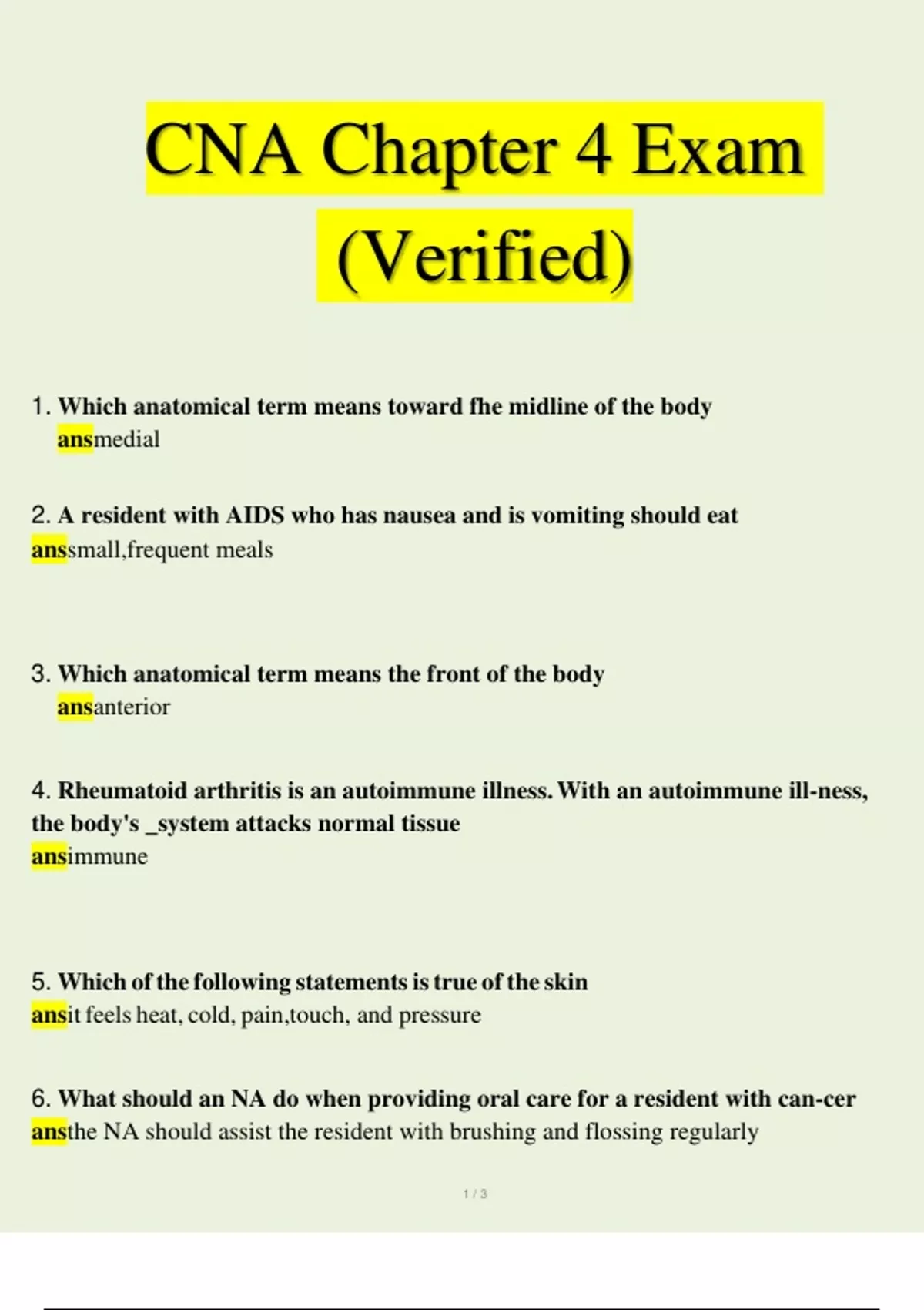 CNA Chapter 4 exam 2023– 2024(Verified) CNA Chapter 4 exam 2023– 2024(Verified) CNA Chapter 4 exam 2023– 2024(Verified) CNA Chapter 4 Exam (Verified) 1. Which anatomical term means toward fhe midline of the body ansmedial 2. A resident with AIDS who has nausea and is vomiting should eat anssmall, frequent meals 3. Which anatomical term means the front of the body ansanterior 4. Rheumatoid arthritis is an autoimmune illness. With an autoimmune ill- ness, the body's _system attacks normal tissue ansimmune 5. Which of the following statements is true of the skin ansit feels heat, cold, pain, touch, and pressure 6. What should an NA do when providing oral care for a resident with can- cer ansthe NA should assist the resident with brushing and flossing regularly 7. A resident with a head or spinal cord injury should be repositioned at least every _ hours ANS2 8. One way a NA can help with normal changes of aging related to the integumentary system is to anskeep sheets wrinkle free 9. Which of the following is true of muscles ansthey provide movement of body parts 10. How many bones are in the human body ANS206