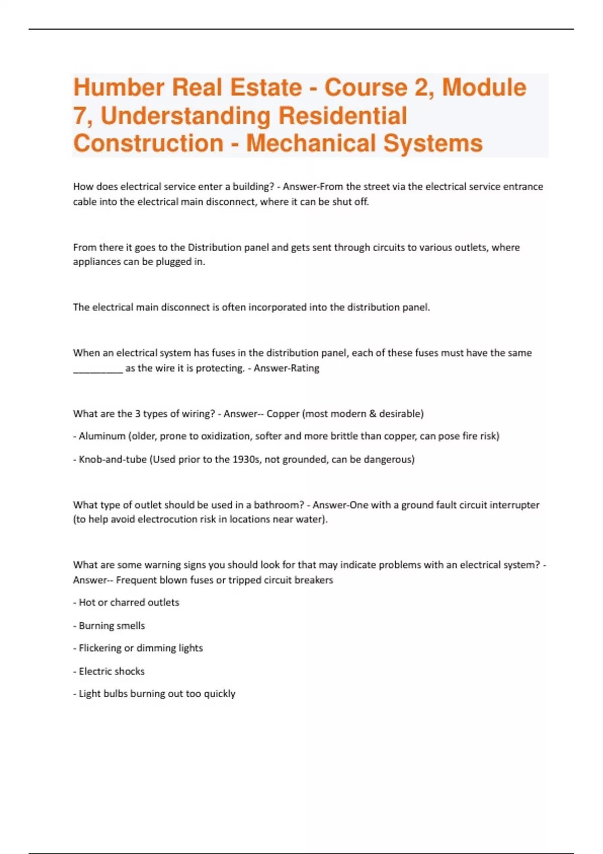 Humber Real Estate - Course 2, Module 7, Understanding Residential Construction - Mechanical Systems Questions and Answers 2024 Complete;100% verified