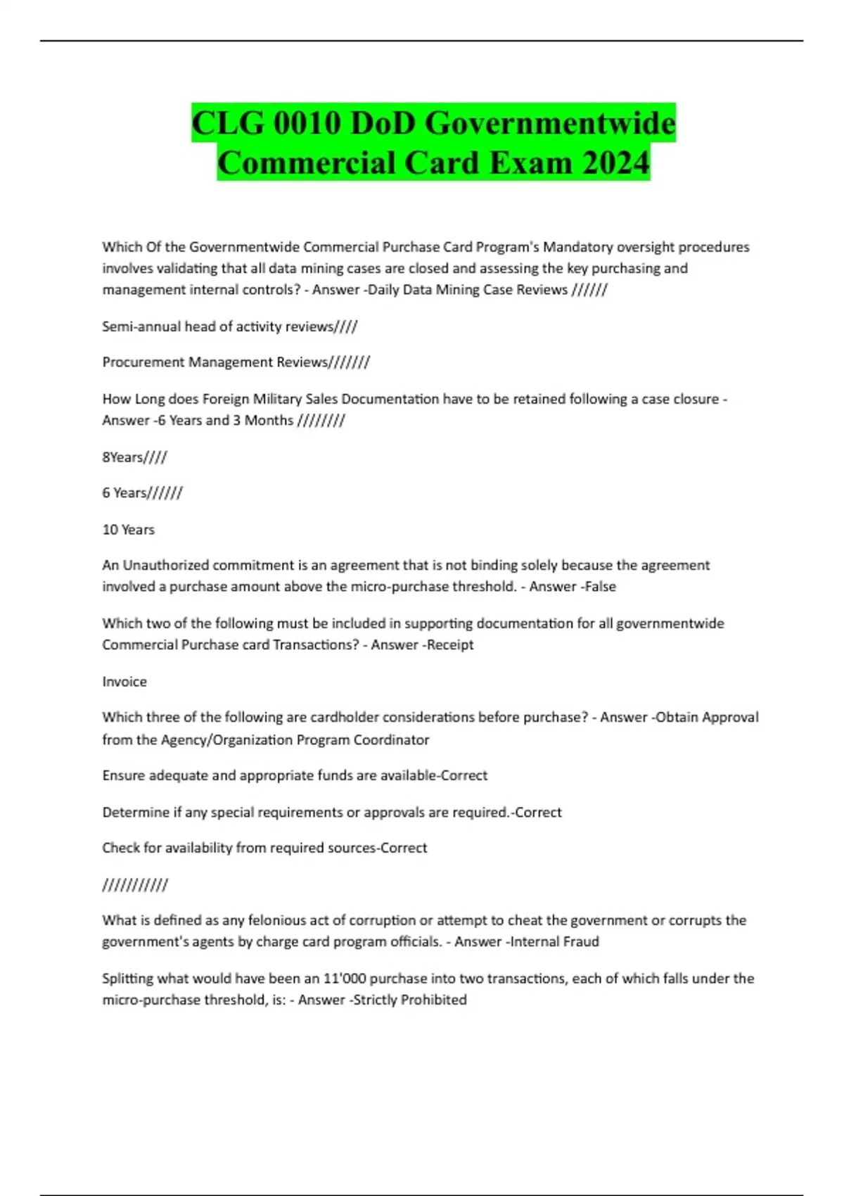 CLG 0010 DoD Governmentwide Commercial Card Exam 2024 Which Of the Governmentwide Commercial Purchase Card Program's Mandatory oversight procedures involves validating that all data mining cases are closed and assessing the key purchasing and management internal controls? - Answer -Daily Data Mining Case Reviews ////// Semi-annual head of activity reviews//// Procurement Management Reviews/////// How Long does Foreign Military Sales Documentation have to be retained following a case closure - Answer -6 Years and 3 Months //////// 8Years//// 6 Years////// 10 Years An Unauthorized commitment is an agreement that is not binding solely because the agreement involved a purchase amount above the micro-purchase threshold. - Answer -False Which two of the following must be included in supporting documentation for all governmentwide Commercial Purchase card Transactions? - Answer -Receipt Invoice Which three of the following are cardholder considerations before purchase? - Answer -Obtain Approval from the Agency/Organization Program Coordinator Ensure adequate and appropriate funds are available-Correct Determine if any special requirements or approvals are required.-Correct Check for availability from required sources-Correct /////////// What is defined as any felonious act of corruption or attempt to cheat the government or corrupts the government's agents by charge card program officials. - Answer -Internal Fraud Splitting what would have been an 11'000 purchase into two transactions, each of which falls under the micro-purchase threshold, is: - Answer -Strictly ProhibitedWhich of the following is the term for a shipment of supplies or equipment that is delayed along the transportation chain and will not move until all problems are resolved? - Answer -Frustrated Freight Whose Responsibility is it to comply with government agency standards of conduct? (Select the three that apply) - Answer -Supervisor Approving/Billing officer Agency/Organization Program Coordinator