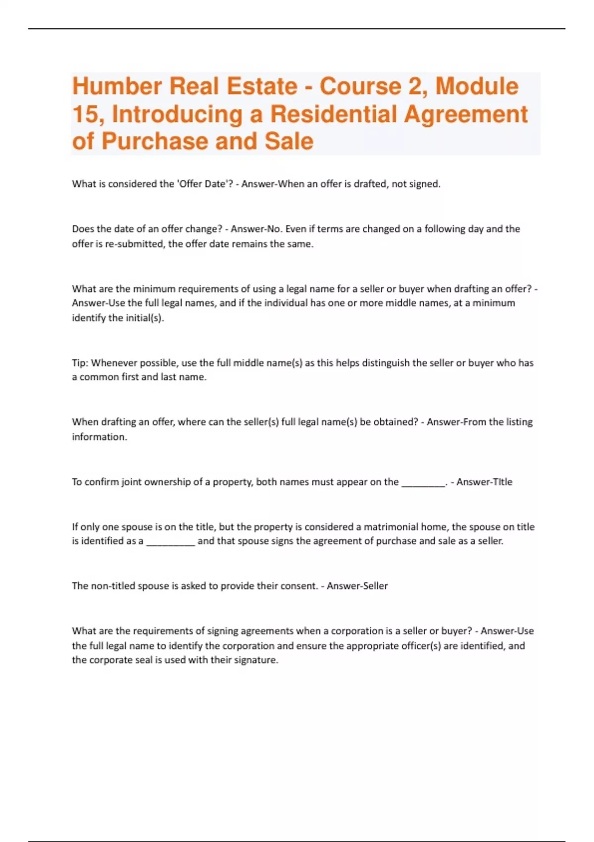 What is considered the 'Offer Date'? - Answer-When an offer is drafted, not signed. Does the date of an offer change? - Answer-No. Even if terms are changed on a following day and the offer is re-submitted, the offer date remains the same. What are the minimum requirements of using a legal name for a seller or buyer when drafting an offer? - Answer-Use the full legal names, and if the individual has one or more middle names, at a minimum identify the initial(s). Tip: Whenever possible, use the full middle name(s) as this helps distinguish the seller or buyer who has a common first and last name. When drafting an offer, where can the seller(s) full legal name(s) be obtained? - Answer-From the listing information. To confirm joint ownership of a property, both names must appear on the ________. - Answer-TItle If only one spouse is on the title, but the property is considered a matrimonial home, the spouse on title is identified as a _________ and that spouse signs the agreement of purchase and sale as a seller. The non-titled spouse is asked to provide their consent. - Answer-Seller What are the requirements of signing agreements when a corporation is a seller or buyer? - Answer-Use the full legal name to identify the corporation and ensure the appropriate officer(s) are identified, and the corporate seal is used with their signature.If a corporation does not have seal to stamp an agreement with, individuals signing can write what phrase on the signature lines on the agreement? - Answer-"I/we have the authority to bind the corporation" When preparing an agreement of purchase and sale for a partnership, you should take what steps? - Answer-- Use the partnership name - Confirm who the partners are, and who has the authority to bind the partnership What's the difference between a general partnership and a limited partnership? - Answer-- In a general partnership, one partner can sign the agreement which binds the partnership - In a limited partnership, a limited partner may not have this authority Who is the only person with legal authority to manage or distribute an estate, and who would be named in the deceased's will? - Answer-An estate trustee How can you verify that an individual has the authority to act as an estate trustee? - Answer-Ask for a notarized copy of probate documents to ensure all the trustees have signed and have the power the sell under the will. True or false? An estate trustee can list a property for sale prior to obtaining probate? - Answer-True, but the title cannot be transferred until probate has been obtained. What is a Power of Attorney (POA)? - Answer-A legal document giving authority for someone to act on behalf of another person. How can you verify someone's Power of Attorney (POA)? - Answer-- Obtain an original copy of the Power of Attorney (POA) or a notarized copy of it. - You must also verify that the POA is legally valid, gives the attorney the authority to sign that particular type of agreement and that the POA is still in full force and effect (e.g. hasn't been revoked by the Donor or has not expired if it had an expiry date).When the person represented by a Power of Attorney dies, the POA is no longer _________. - AnswerValid Why might a buyer use a trustee to make an offer? - Answer-To remain anonymous or to incorporate a company. To ensure a complete description for each property is identified, what information would be included in an agreement of purchase and sale? - Answer-- Address - Side of the road the property is fronting on - Municipality, city, township, region - Lot size - Legal description including any easements How can you determine the direction a house is fronting on? - Answer-Put yourself facing the front of the house. The direction you are facing is the side of the road the property is fronting on. When filling out an agreement of purchase and sale, if a property is listed in the lower tier, you should also include the _______ _____. - Answer-Upper tier