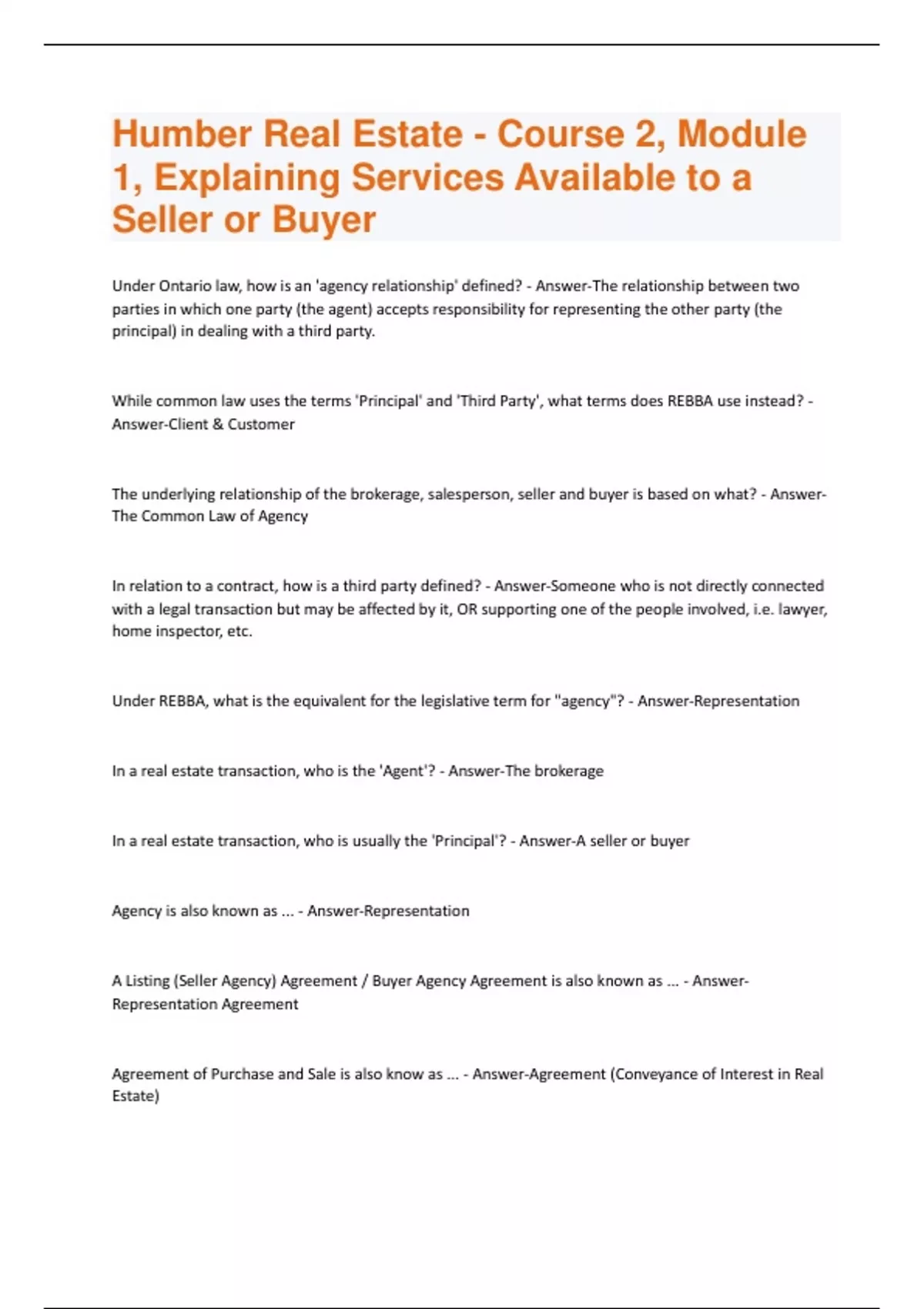 Humber Real Estate - Course 2, Module 1, Explaining Services Available to a Seller or Buyer Questions and Answers