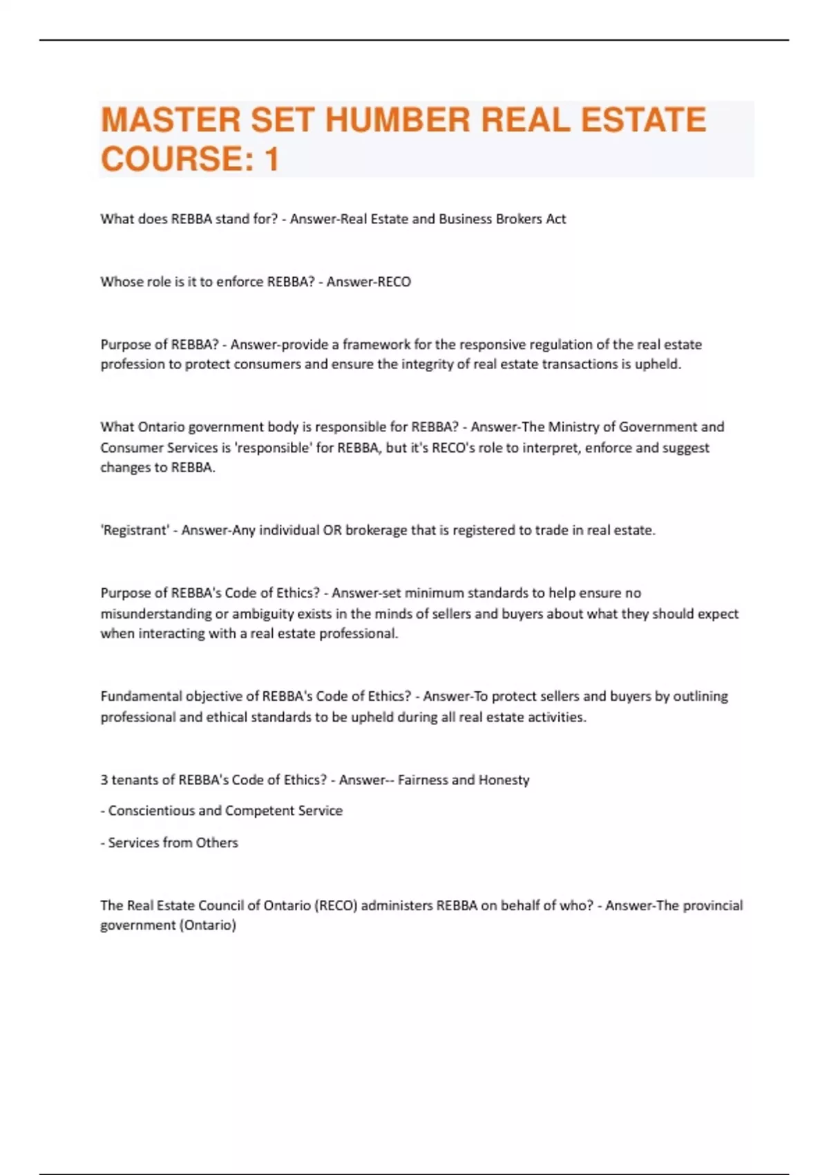 What does REBBA stand for? - Answer-Real Estate and Business Brokers Act Whose role is it to enforce REBBA? - Answer-RECO Purpose of REBBA? - Answer-provide a framework for the responsive regulation of the real estate profession to protect consumers and ensure the integrity of real estate transactions is upheld. What Ontario government body is responsible for REBBA? - Answer-The Ministry of Government and Consumer Services is 'responsible' for REBBA, but it's RECO's role to interpret, enforce and suggest changes to REBBA. 'Registrant' - Answer-Any individual OR brokerage that is registered to trade in real estate. Purpose of REBBA's Code of Ethics? - Answer-set minimum standards to help ensure no misunderstanding or ambiguity exists in the minds of sellers and buyers about what they should expect when interacting with a real estate professional. Fundamental objective of REBBA's Code of Ethics? - Answer-To protect sellers and buyers by outlining professional and ethical standards to be upheld during all real estate activities. 3 tenants of REBBA's Code of Ethics? - Answer-- Fairness and Honesty - Conscientious and Competent Service - Services from Others The Real Estate Council of Ontario (RECO) administers REBBA on behalf of who? - Answer-The provincial government (Ontario)Mission of The Real Estate Council of Ontario (RECO)? - Answer-To support a fair, safe and informed real estate market for consumers in Ontario through innovative regulation of the services offered by those who trade in real estate. How does RECO work in the public interest? - Answer-1. Enforcing standards to obtain & maintain registration. 2. Establishing education standards. 3. Establishing & administering insurance requirements (including consumer deposit protection). 4. Addressing inquiries, concerns, & complaints about the conduct of a brokerage, broker, or salesperson and taking appropriate action. 5. Conducting inspections of brokerages to ensure compliance with REBBA and to educate brokers of record. 6. Consumer protection education and information for sellers & buyers involved in real estate transactions. What is required to trade in real estate in Ontario? - Answer-Registration with RECO What is RECO's definition of 'Trading' in real estate? - Answer-Trading includes any activity, such as listing a property for sale, showing a property to a buyer, negotiating an offer for a seller or a buyer, or any act, advertisement or conduct that would further any purchase, sale, exchange, option, lease or rental of a property. General term used to refer to all brokerages, brokers & salespersons registered under REBBA? - AnswerRegistrant What are the 3 professional categories permitted under REBBA? - Answer-Brokerage, Broker & Salesperson Define "'Brokerage' - Answer-A corporation, partnership or sole proprietorship that trades in real estate on behalf of others for compensation or reward, or expectation thereof.Who represents or provides services to a seller or buyer? - Answer-The brokerage (NOT the individual broker or salesperson). Under REBBA, all brokers and salespersons are deemed employees of the brokerage. Define 'Broker' - Answer-An individual who has the prescribed qualifications to be registered as a broker under REBBA and who is employed by a brokerage to trade in real estate. Define 'Salesperson' - Answer-An individual with the prescribed qualifications to be registered as a salesperson under REBBA and who is employed by a brokerage to trade in real estate. What is required to maintain registration as a salesperson? - Answer-Paying annual fees and additional educational requirements. Define 'Broker of Record' - Answer-An individual who is a broker and is designated by the brokerage to ensure compliance with REBBA. What is the job of the Broker of Record? - Answer-To be responsible for all activities of the brokerage, including all brokers, salespersons and all other employees of the brokerage and to ensure compliance with REBBA. What are the 3 steps required to register with RECO? - Answer-1. Complete the registration education requirements. 2. Register with RECO once employed by a brokerage. 3. Purchase insurance coverage through the RECO Insurance Program