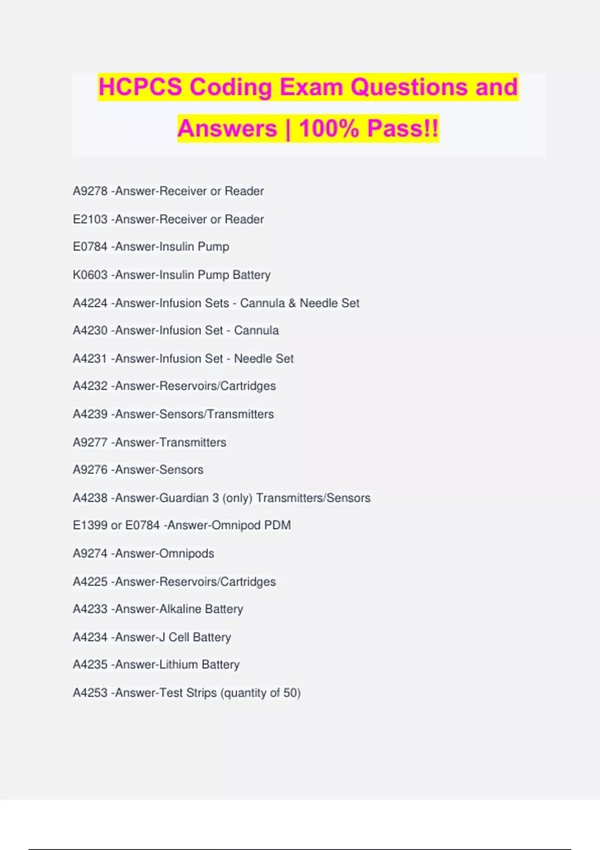 HCPCS Coding Exam Questions and Answers | 100% Pass!! A9278 -Answer-Receiver or Reader E2103 -Answer-Receiver or Reader E0784 -Answer-Insulin Pump K0603 -Answer-Insulin Pump Battery A4224 -Answer-Infusion Sets - Cannula & Needle Set A4230 -Answer-Infusion Set - Cannula A4231 -Answer-Infusion Set - Needle Set A4232 -Answer-Reservoirs/Cartridges A4239 -Answer-Sensors/Transmitters A9277 -Answer-Transmitters A9276 -Answer-Sensors A4238 -Answer-Guardian 3 (only) Transmitters/Sensors E1399 or E0784 -Answer-Omnipod PDM A9274 -Answer-Omnipods A4225 -Answer-Reservoirs/Cartridges A4233 -Answer-Alkaline Battery