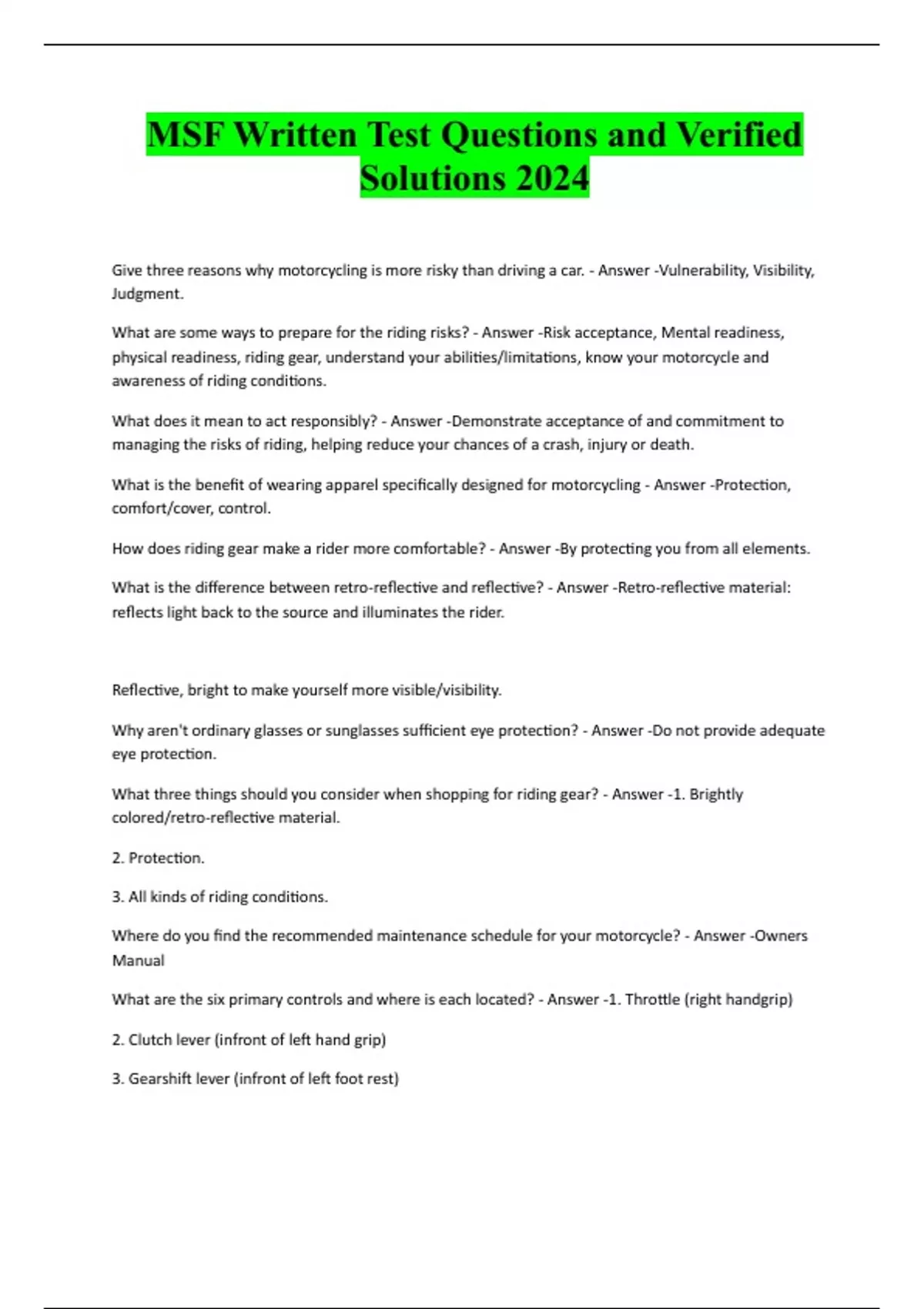 MSF Written Test Questions and Verified Solutions 2024 Give three reasons why motorcycling is more risky than driving a car. - Answer -Vulnerability, Visibility, Judgment. What are some ways to prepare for the riding risks? - Answer -Risk acceptance, Mental readiness, physical readiness, riding gear, understand your abilities/limitations, know your motorcycle and awareness of riding conditions. What does it mean to act responsibly? - Answer -Demonstrate acceptance of and commitment to managing the risks of riding, helping reduce your chances of a crash, injury or death. What is the benefit of wearing apparel specifically designed for motorcycling - Answer -Protection, comfort/cover, control. How does riding gear make a rider more comfortable? - Answer -By protecting you from all elements. What is the difference between retro-reflective and reflective? - Answer -Retro-reflective material: reflects light back to the source and illuminates the rider. Reflective, bright to make yourself more visible/visibility. Why aren't ordinary glasses or sunglasses sufficient eye protection? - Answer -Do not provide adequate eye protection. What three things should you consider when shopping for riding gear? - Answer -1. Brightly colored/retro-reflective material. 2. Protection. 3. All kinds of riding conditions