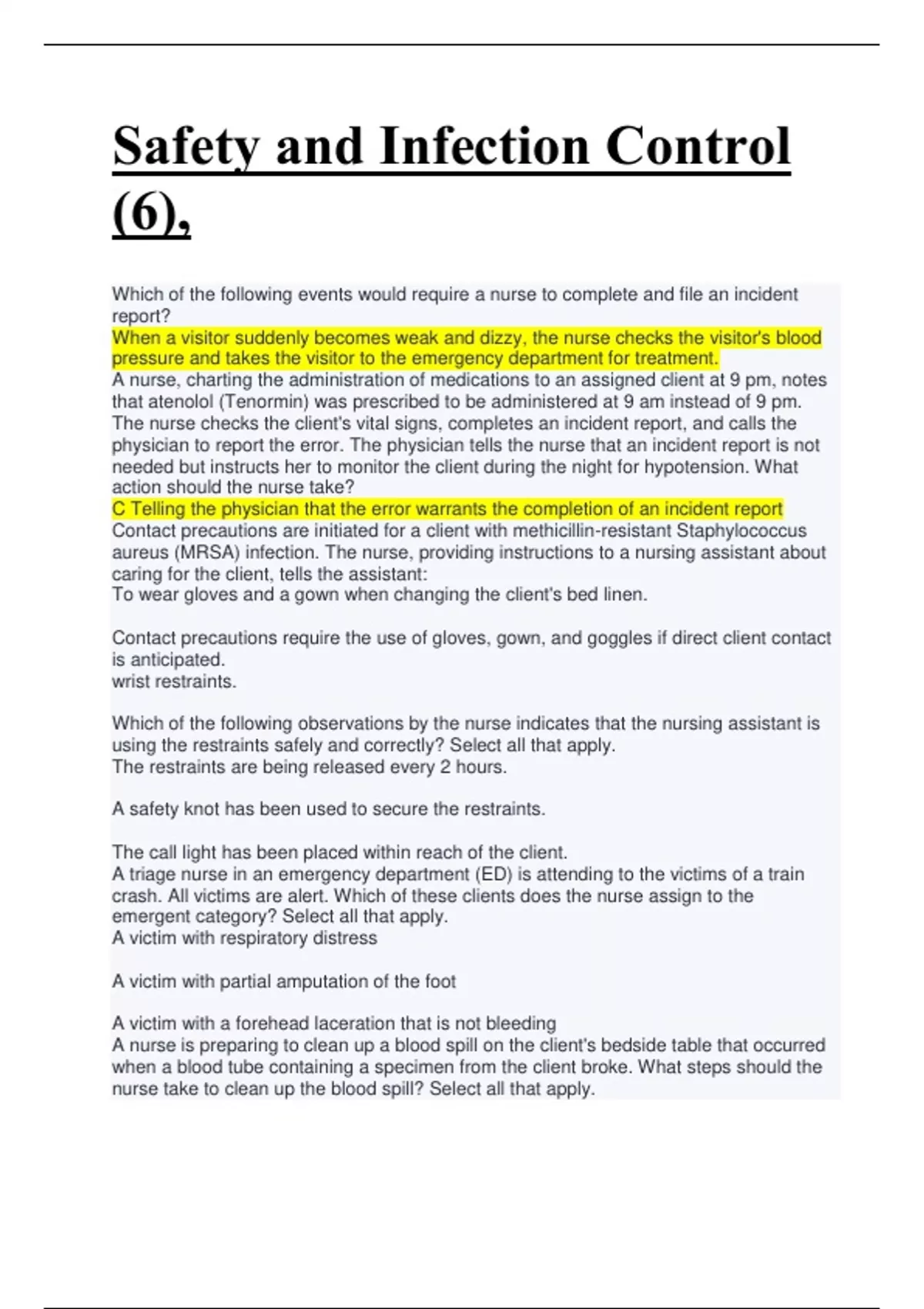 Which of the following events would require a nurse to complete and file an incident report? When a visitor suddenly becomes weak and dizzy, the nurse checks the visitor's blood pressure and takes the visitor to the emergency department for treatment. A nurse, charting the administration of medications to an assigned client at 9 pm, notes that atenolol (Tenormin) was prescribed to be administered at 9 am instead of 9 pm. The nurse checks the client's vital signs, completes an incident report, and calls the physician to report the error. The physician tells the nurse that an incident report is not needed but instructs her to monitor the client during the night for hypotension. What action should the nurse take? C Telling the physician that the error warrants the completion of an incident report Contact precautions are initiated for a client with methicillin-resistant Staphylococcus aureus (MRSA) infection. The nurse, providing instructions to a nursing assistant about caring for the client, tells the assistant: To wear gloves and a gown when changing the client's bed linen