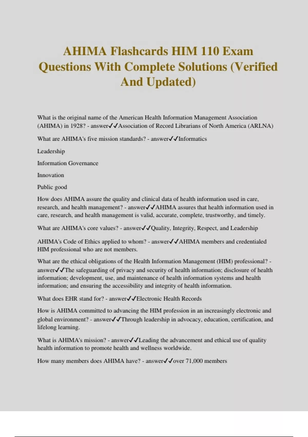 AHIMA Flashcards HIM 110 Exam Questions With Complete Solutions (Verified And Updated) What is the original name of the American Health Information Management Association (AHIMA) in 1928? - answerAssociation of Record Librarians of North America (ARLNA) What are AHIMA's five mission standards? - answerInformatics Leadership Information Governance Innovation Public good How does AHIMA assure the quality and clinical data of health information used in care, research, and health management? - answerAHIMA assures that health information used in care, research, and health management is