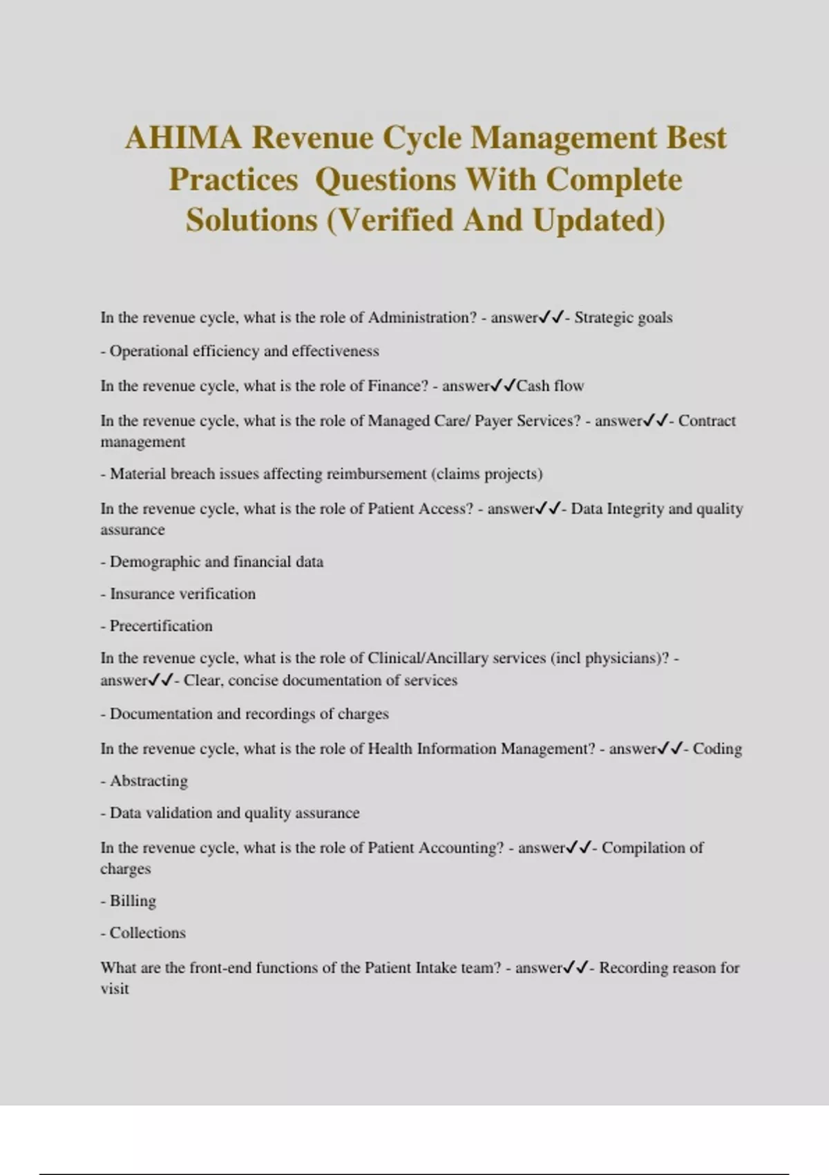 AHIMA Revenue Cycle Management Best Practices Questions With Complete Solutions (Verified And Updated)